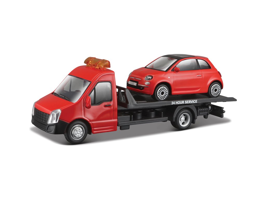 Model Bburago 18-31402 - Odtahovka s modelem auta Fiat 500 v měřítku 1:43 je vyrobený z kovových a plastových dílů. Model má pohyblivou nákladovou plochu pro najíždění a sjíždění modelu auta. Barva modelů je červená.