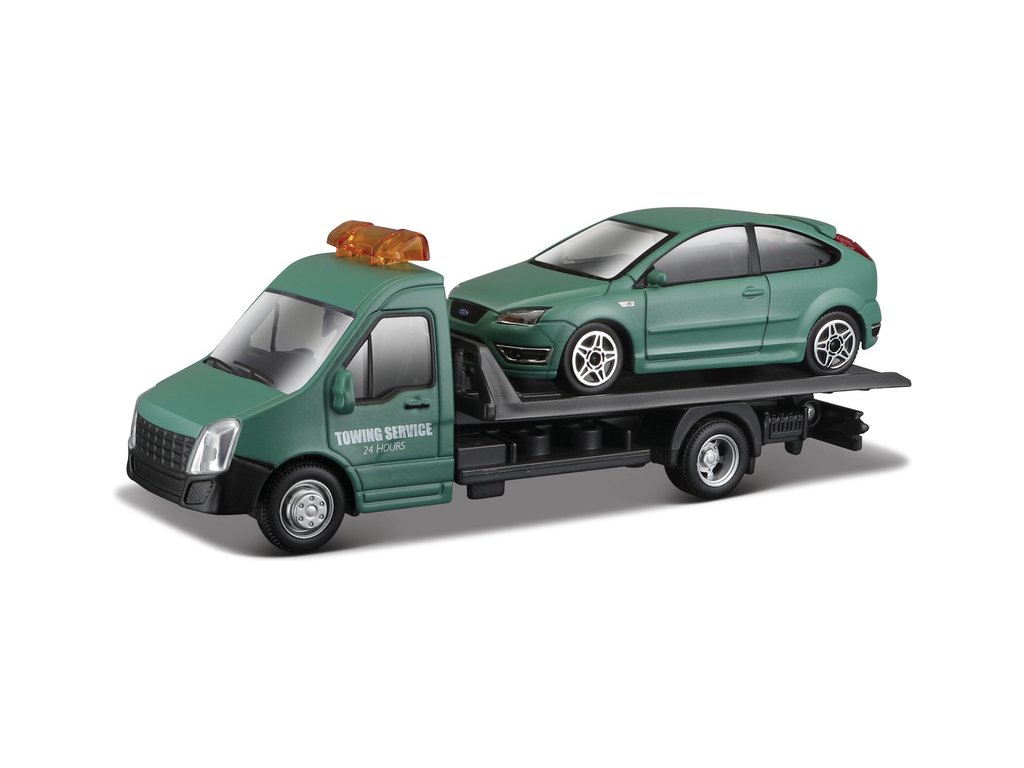 Kovový model Bburago 18-31404 - Odtahovka s modelem auta Ford Focus ST v měřítku 1:43. Je vyroben z kovových a plastových dílů. Model má pohyblivou nákladovou plochu, pryžové pneumatiky, detailní zpracování. Barva modelů je zelená, odtahovka je velká přibližně 17 cm, autíčko je velké přibližně 10 cm.