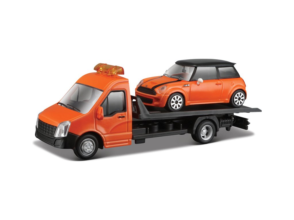 Kovový model Bburago 18-31405 - Odtahovka s modelem auta Mini Cooper S v měřítku 1:43. Je vyroben z kovových a plastových dílů. Model má pohyblivou nákladovou plochu, pryžové pneumatiky, detailní zpracování. Barva modelů je oranžová, odtahovka je velká přibližně 17 cm, autíčko je velké přibližně 10 cm.