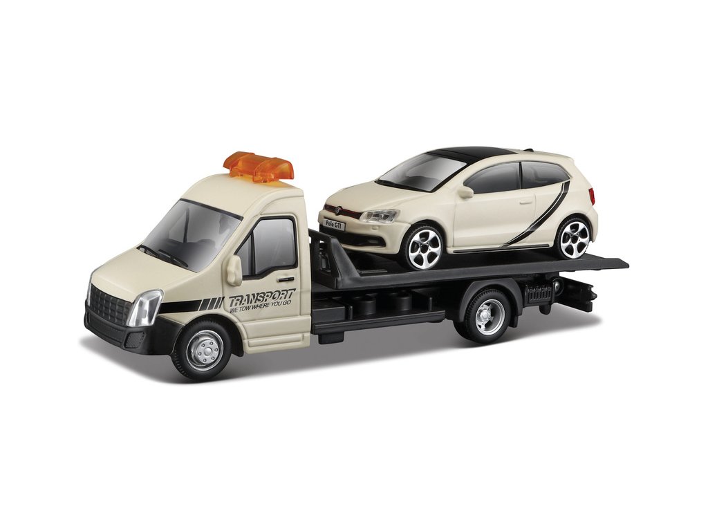 Model Bburago 18-31403 - Odtahovka s modelem auta VW Polo GTI Mark 5 v měřítku 1:43 je vyrobený z kovových a plastových dílů. Model má pohyblivou nákladovou plochu pro najíždění a sjíždění modelu auta. Barva modelů je béžová.
