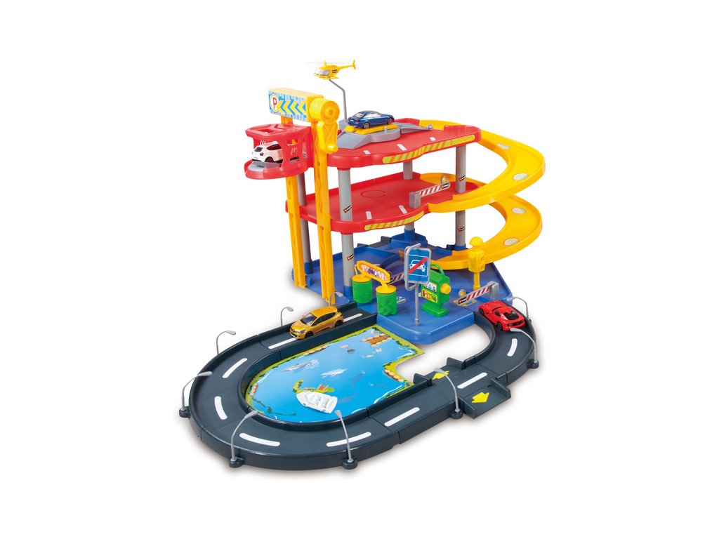 Balení obsahuje: 2 autíčka v různých barvách o velikosti přibližně 10 cm, 3 základny pro každé patero, 3 zatáčky na vytvoření okruhu, 2 zákruty na poschodí, mycí linku, výtah, závory na parkoviště, semafor, značku, sloupky na vytvoření jednotlivých pater, nálepky, obrázkovou maketu jezírka, přistávající rampu pro vrtulník.