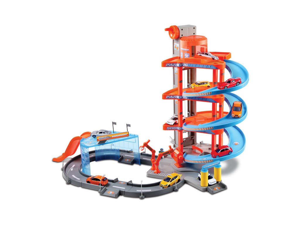 Garáž vyrobenou z atraktivně probarvených plastových dílků lze lehce složit a rozložit. Pak už stačí pouze zapojit vlastní fantazii a začít zažívat nekonečnou zábavu a dobrodružství. Auto je možné si vyzvednou ze showroomu, spustit jej po svažující se silnici vedoucí z každého patra garáže a nakonec projet automyčkou!