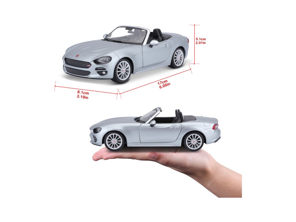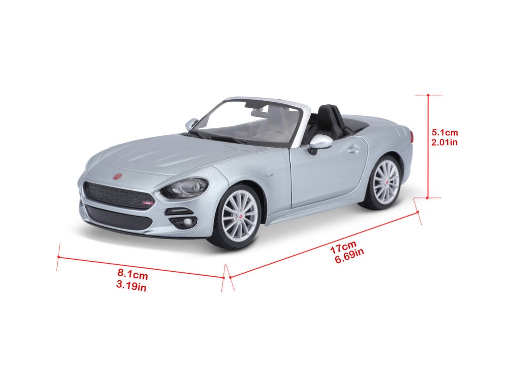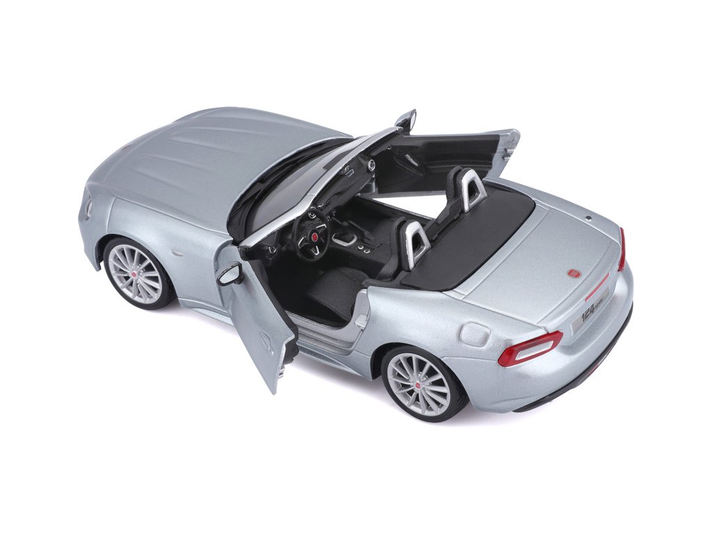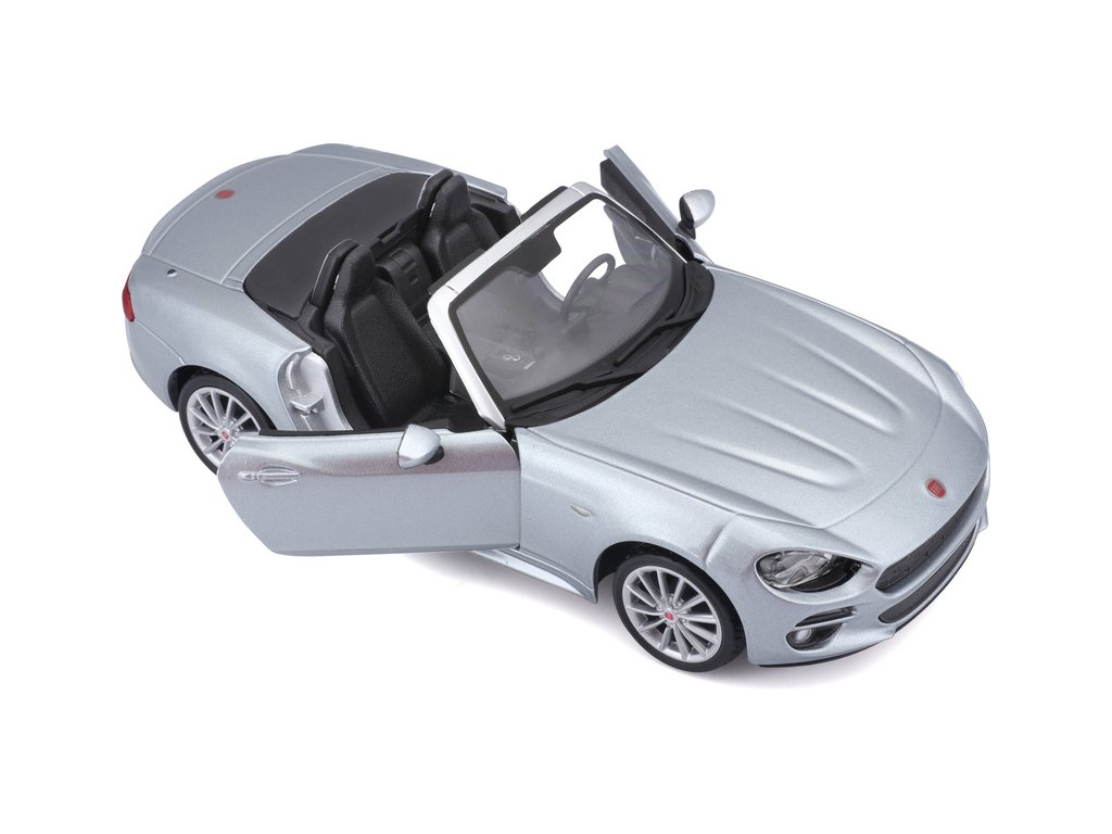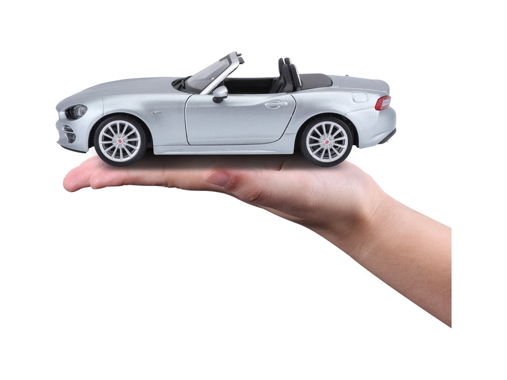 Kovový model auta 1:24 Bburago 18-21083 Plus Fiat 124 Spider nejen pro sběratele. Má otevírací dveře. Zbarvení karosérie je stříbrná metalíza a je velký přibližně 18 cm.