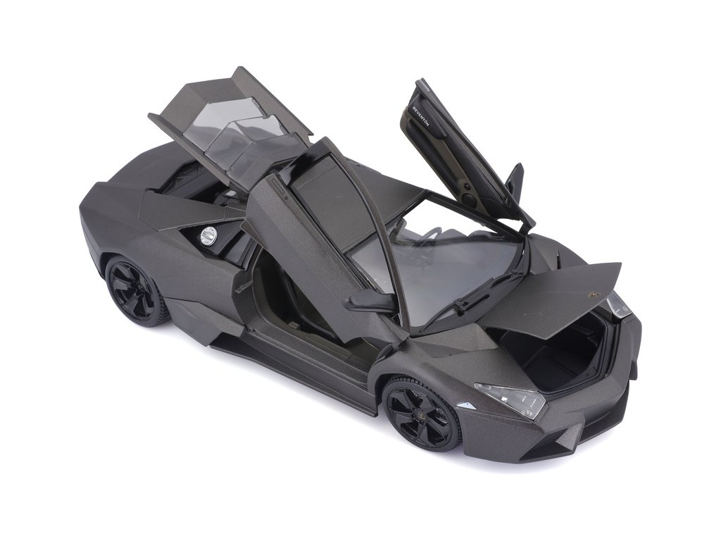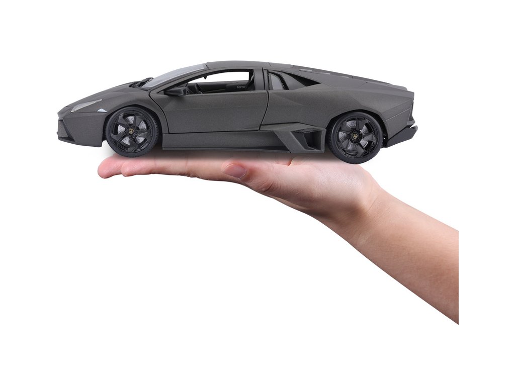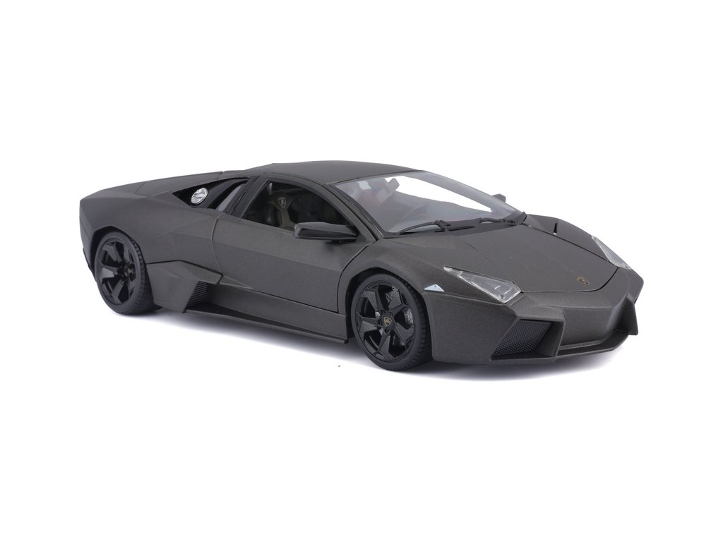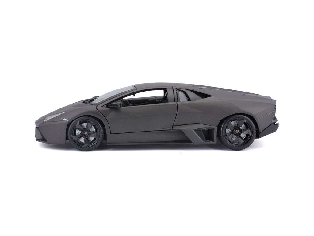 Kovový model auta 1:18 Bburago 18-11029 Plus Lamborghini Reventón nejen pro sběratele. Má otevírací dveře a kapotu, natáčení kol volantem je plně funkční. Barva modelu je šedá a je přibližně 24 cm velký.