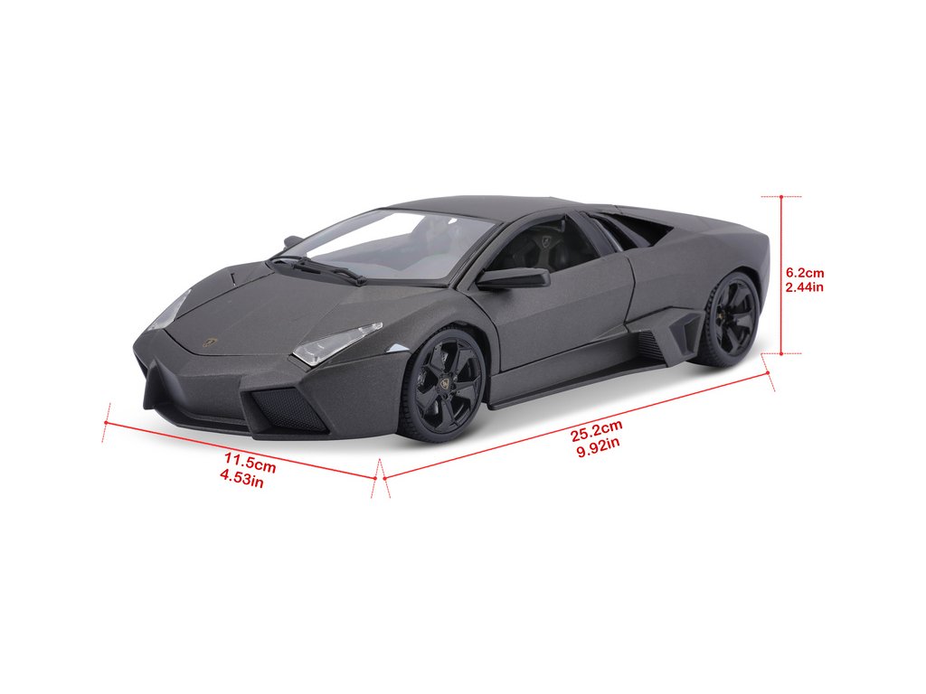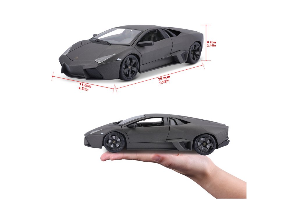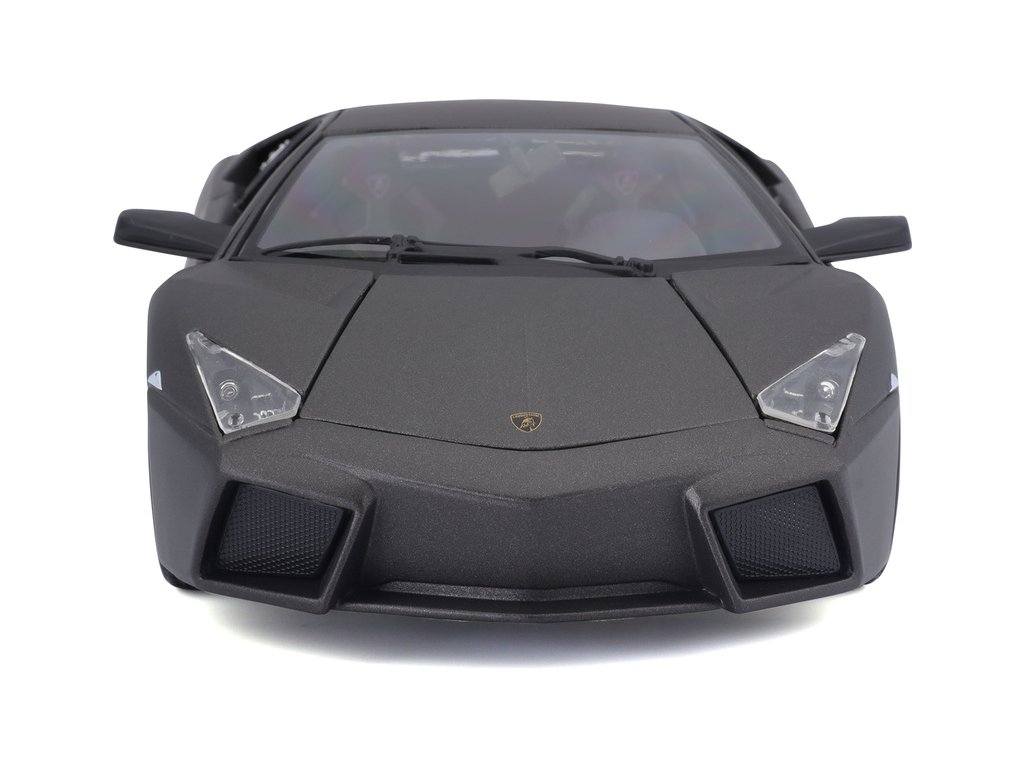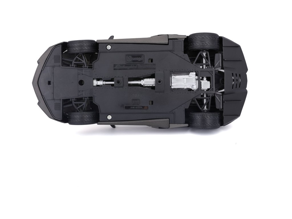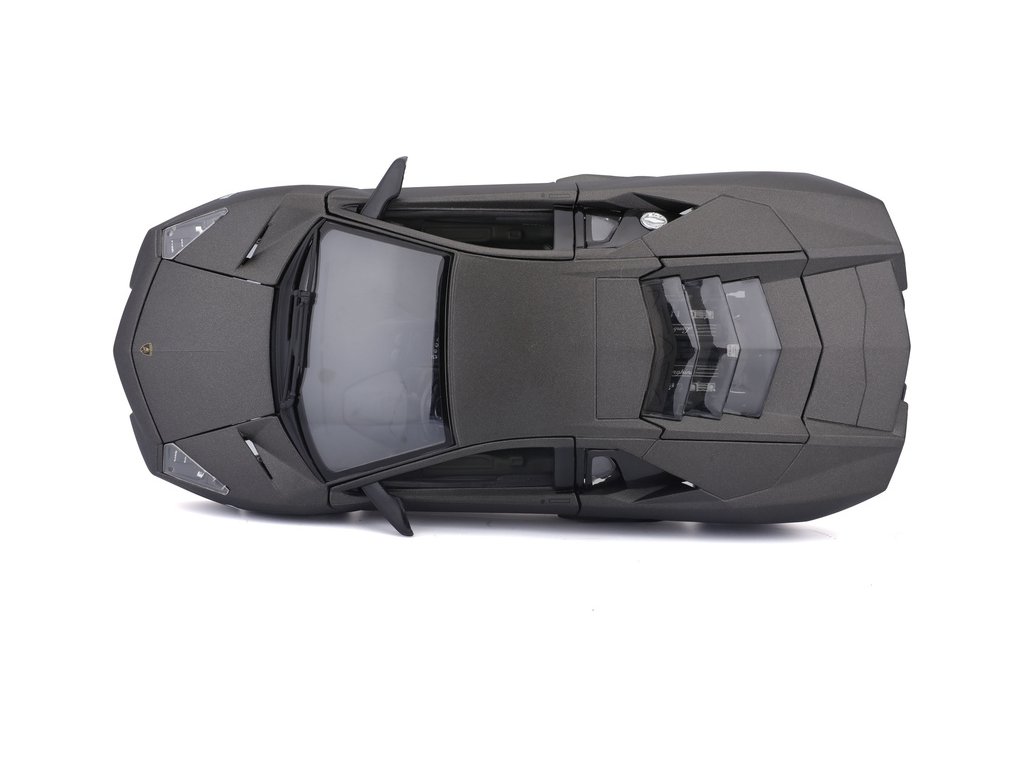 Kovový model auta 1:18 Bburago 18-11029 Plus Lamborghini Reventón nejen pro sběratele. Má otevírací dveře a kapotu, natáčení kol volantem je plně funkční. Barva modelu je šedá a je přibližně 24 cm velký.