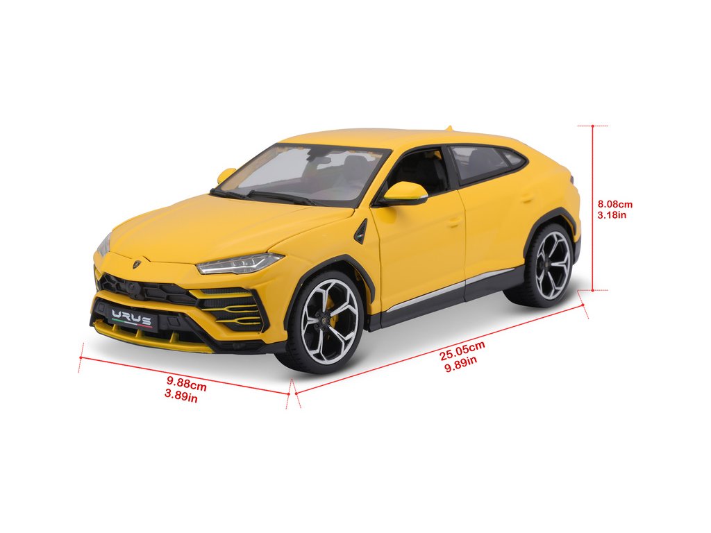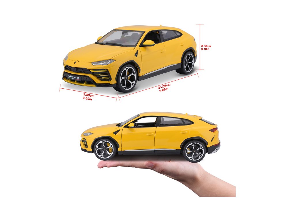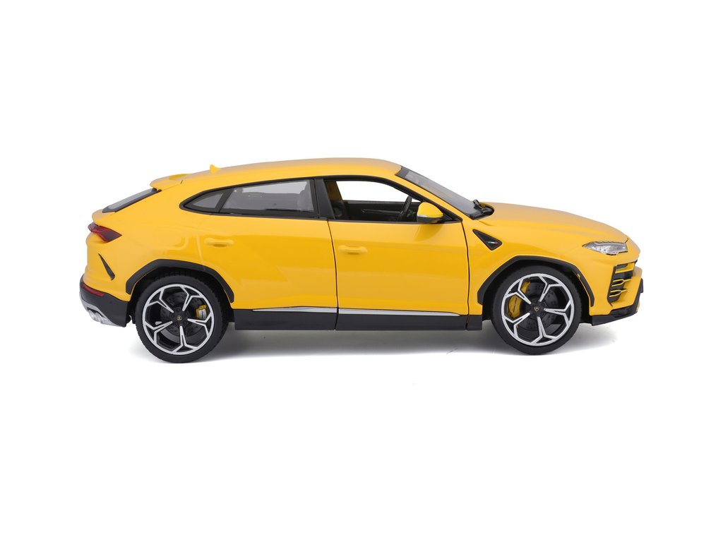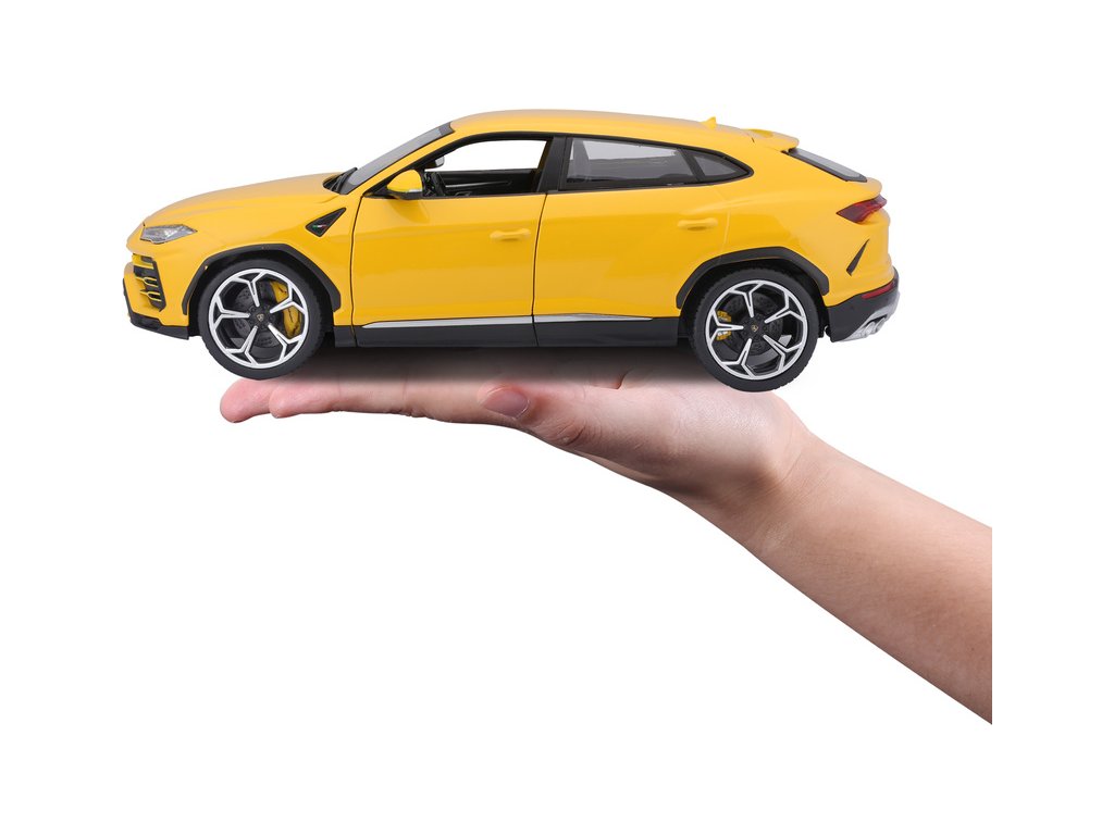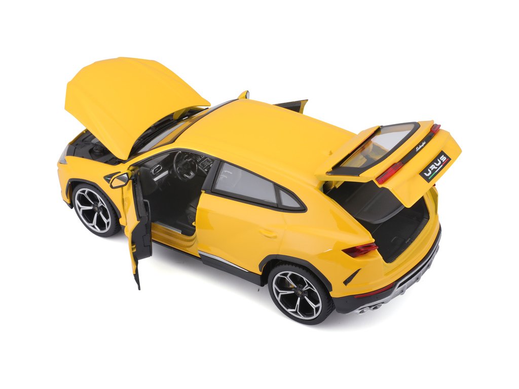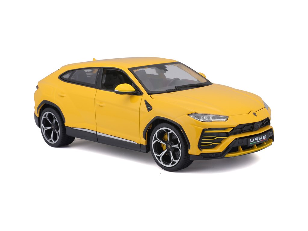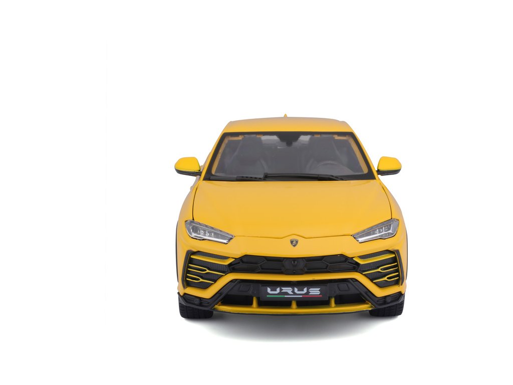 Kovový model auta v měřítku 1:18 Bburago 18-11042 Plus Lamborghini Urus. Barva modelu je žlutá a je přibližně 22 cm velký. Model má otevírací dveře a kapotu, natáčení kol volantem je plně funkční.