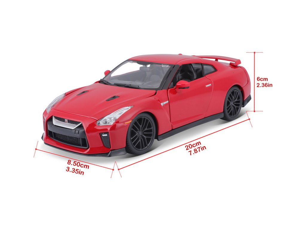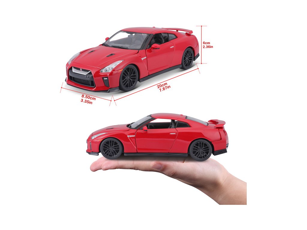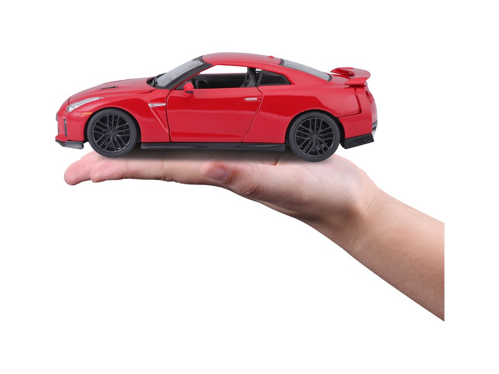 Kovový model auta 1:24 Bburago 18-21082 Plus, Nissan GT-R, nejen pro sběratele. Má otevírací dveře. Barva modelu je červená a je přibližně 17 cm velký.