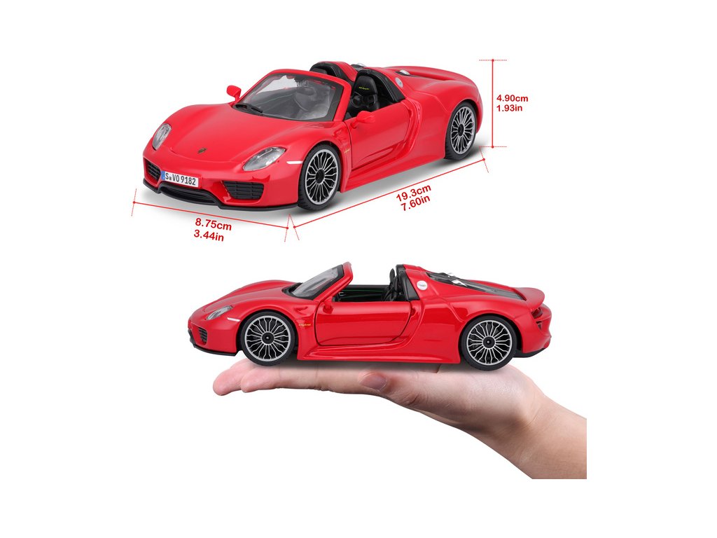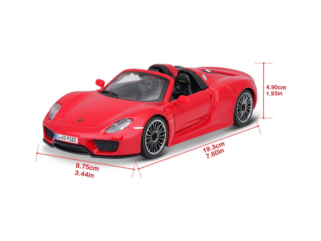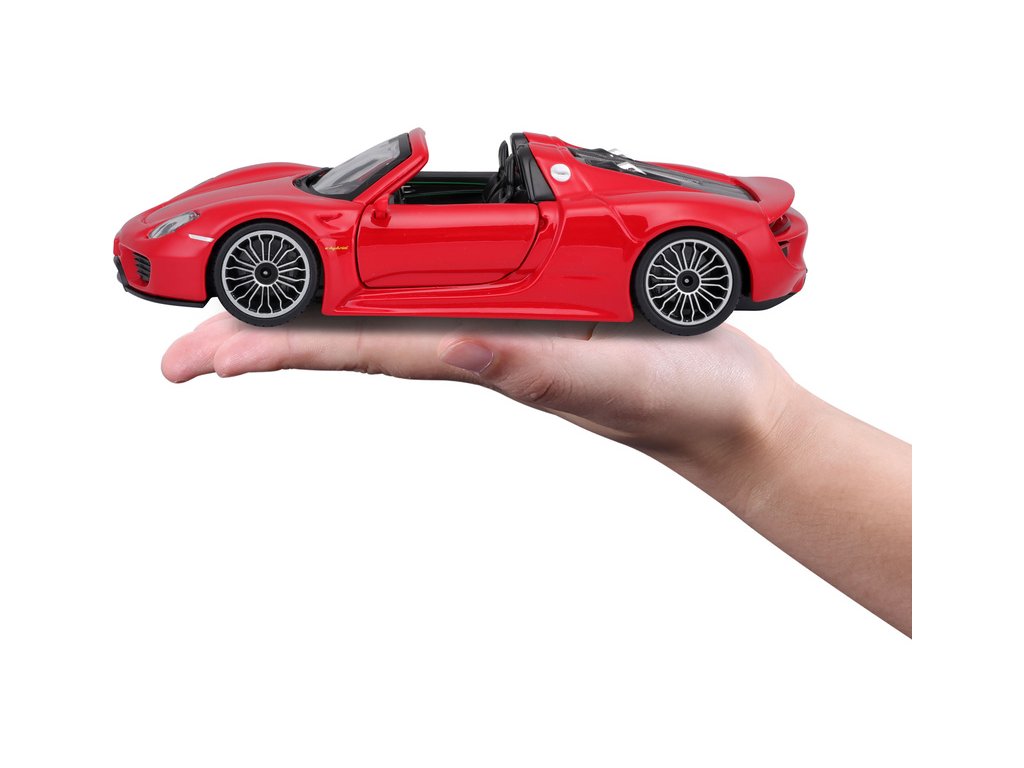 Kovový model auta 1:24 Bburago Plus 18-21076 Porsche 918 Spyder nejen pro sběratele. Má otevírací dveře a natáčení kol. Barva modelu je červená a je přibližně 19 cm velký.