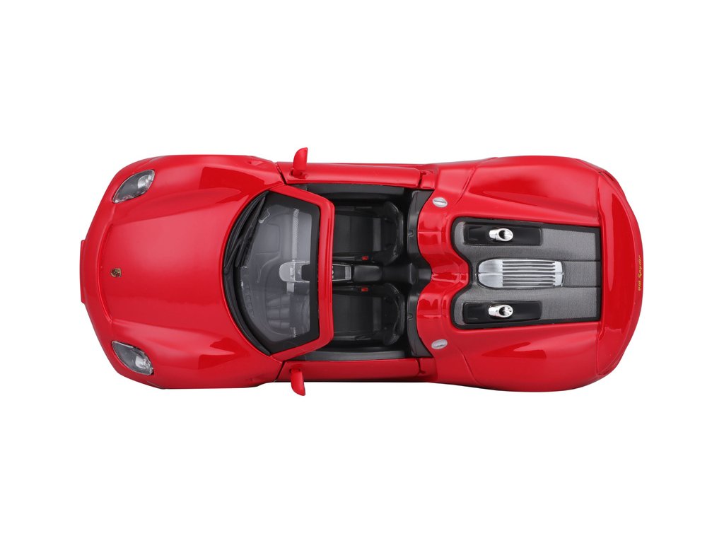 Kovový model auta 1:24 Bburago Plus 18-21076 Porsche 918 Spyder nejen pro sběratele. Má otevírací dveře a natáčení kol. Barva modelu je červená.