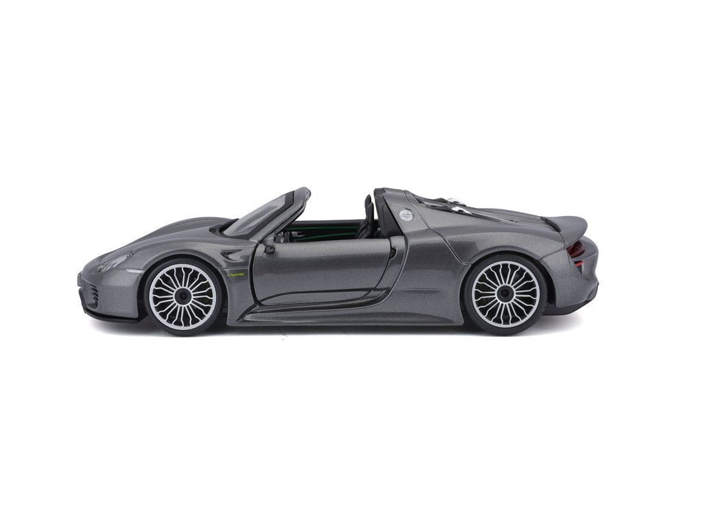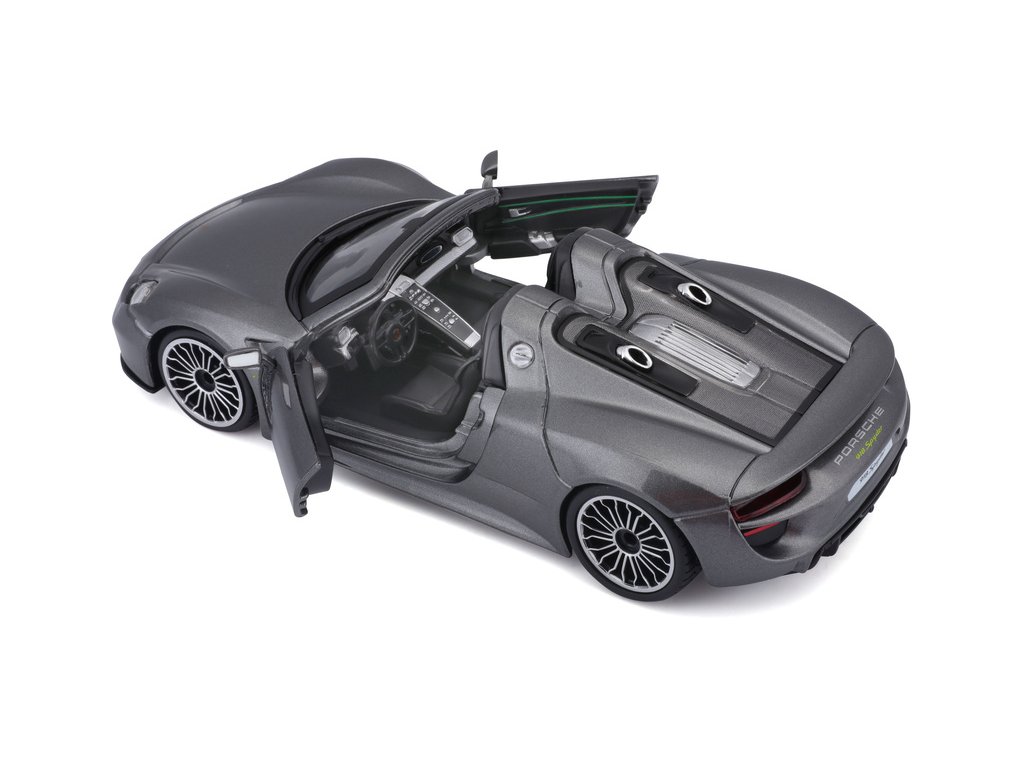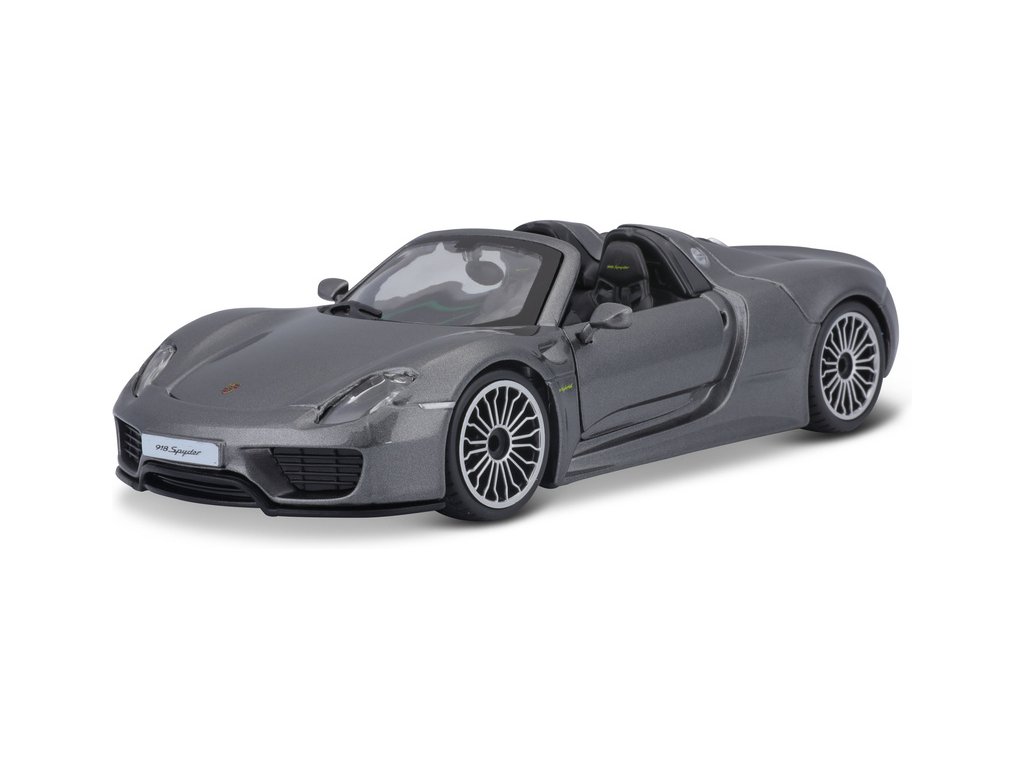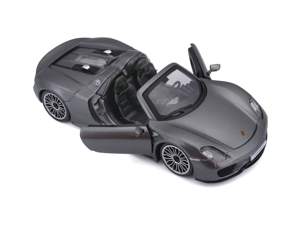 Kovový model auta 1:24 Bburago Plus 18-21076 Porsche 918 Spyder nejen pro sběratele. Má otevírací dveře a natáčení kol. Barva modelu je stříbrná.