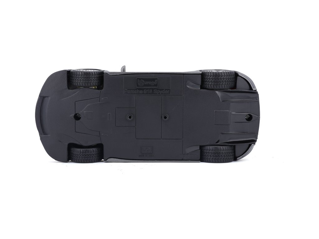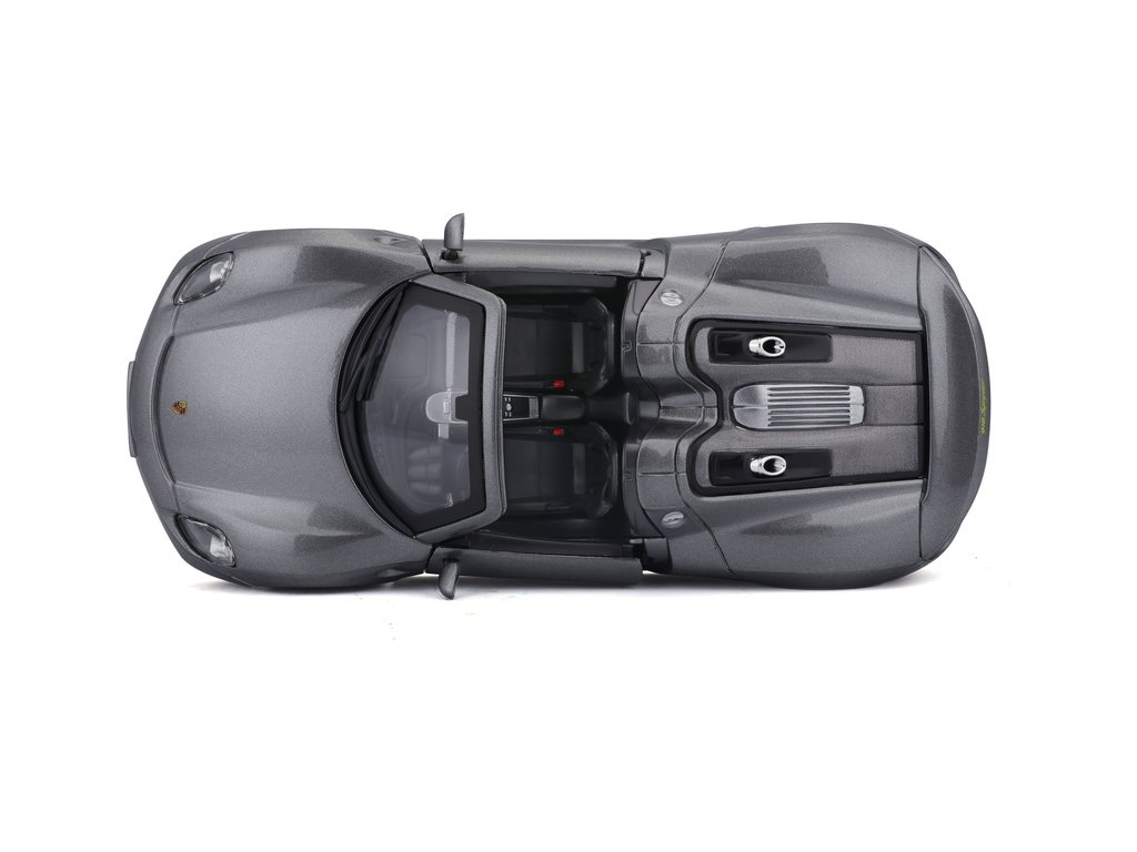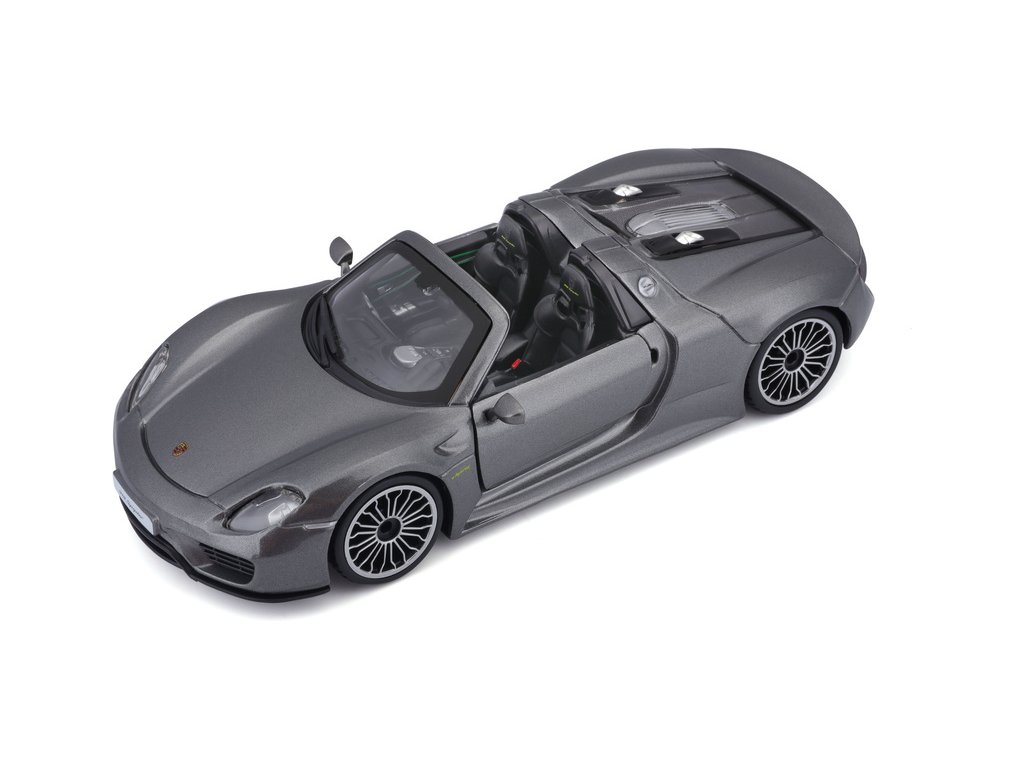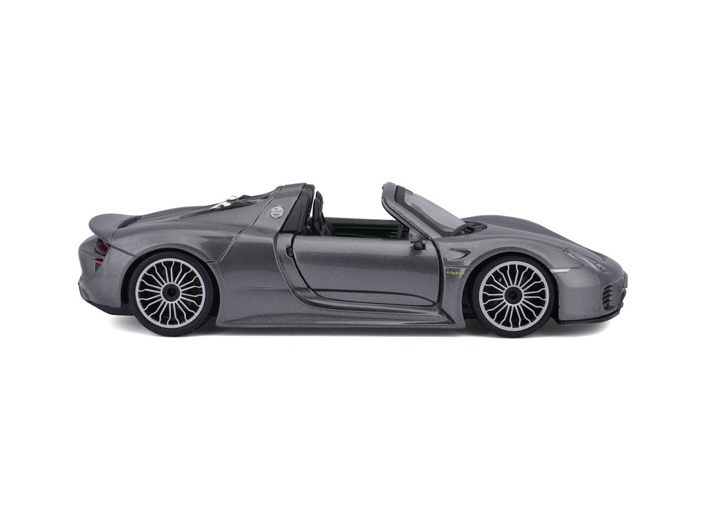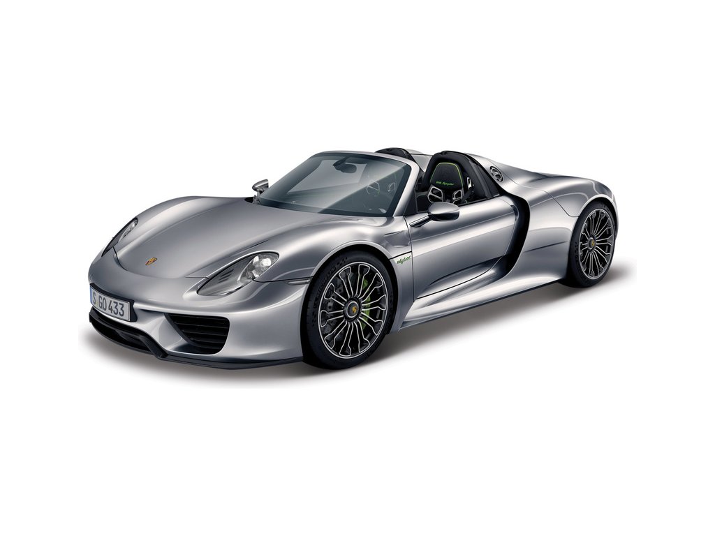 Kovový model auta 1:24 Bburago Plus 18-21076 Porsche 918 Spyder nejen pro sběratele. Má otevírací dveře a natáčení kol. Barva modelu je stříbrná.