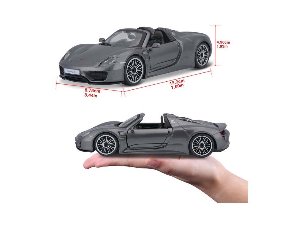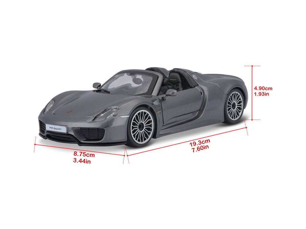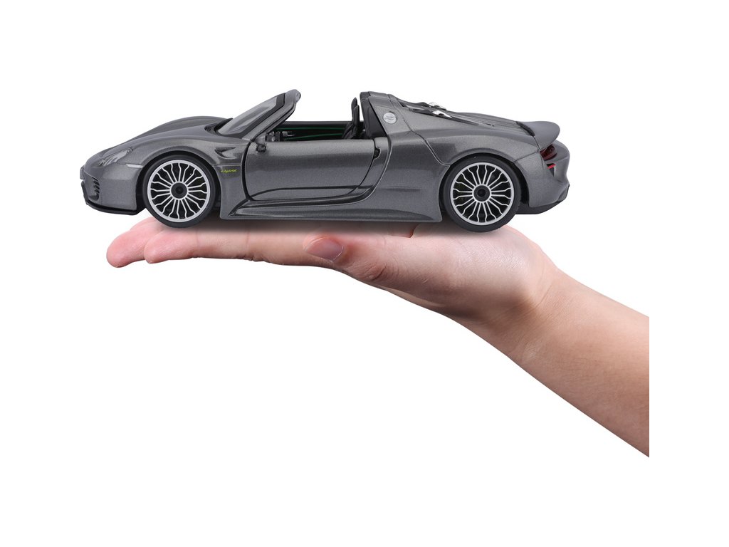 Kovový model auta 1:24 Bburago Plus 18-21076 Porsche 918 Spyder nejen pro sběratele. Má otevírací dveře a natáčení kol. Barva modelu je stříbrná a je přibližně 19 cm velký.