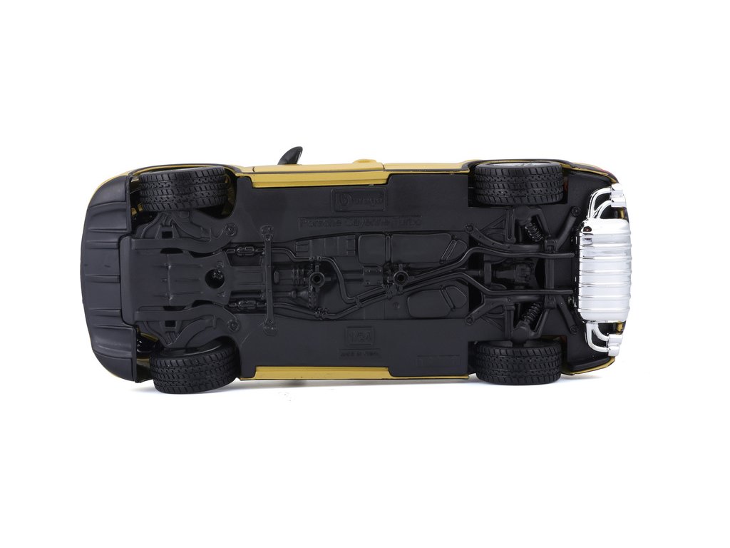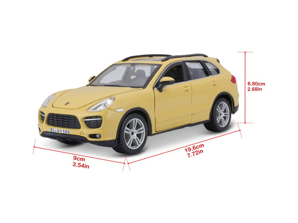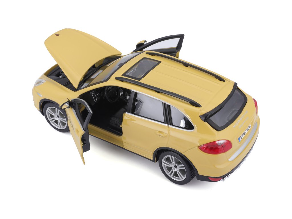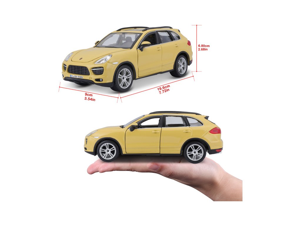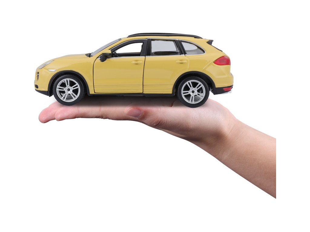 Kovový model auta 1:24 Bburago Plus 18-21056 Porsche Cayenne Turbo nejen pro sběratele. Má otevírací dveře a kapotu, natáčení kol volantem je plně funkční. Barva modelu je žlutá a je přibližně 19 cm velký.