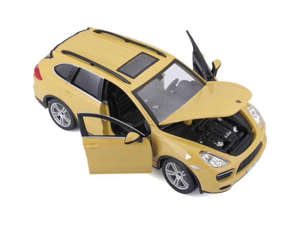 Kovový model auta 1:24 Bburago Plus 18-21056 Porsche Cayenne Turbo nejen pro sběratele. Má otevírací dveře a kapotu, natáčení kol volantem je plně funkční. Barva modelu je žlutá.