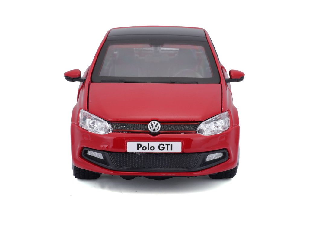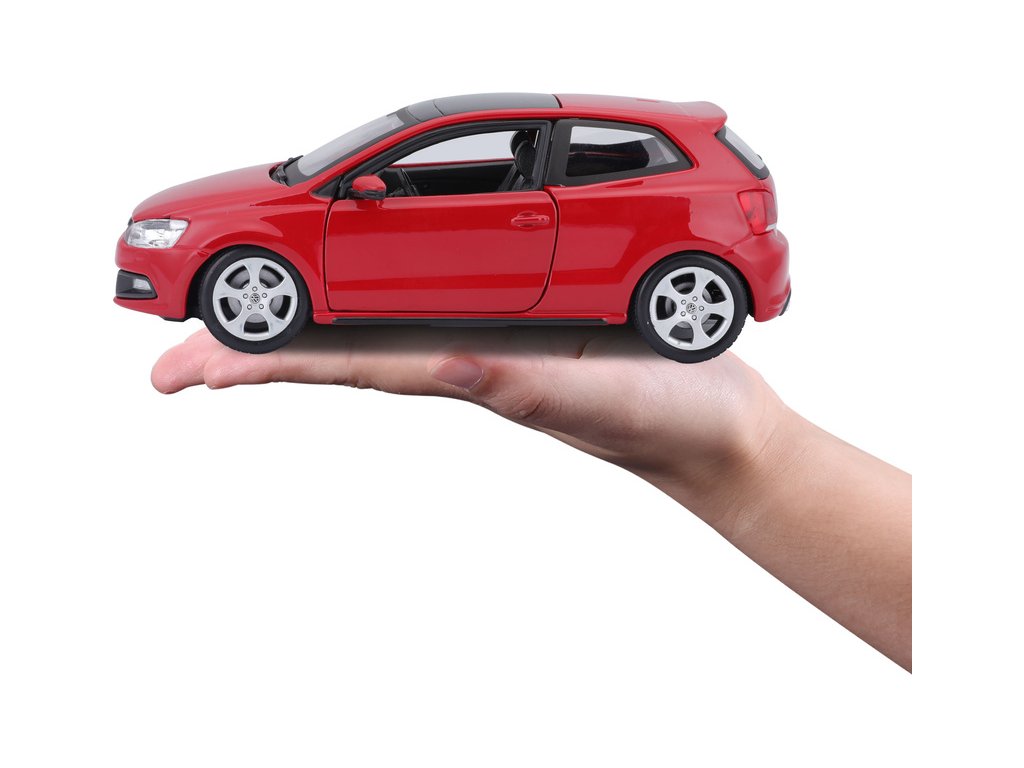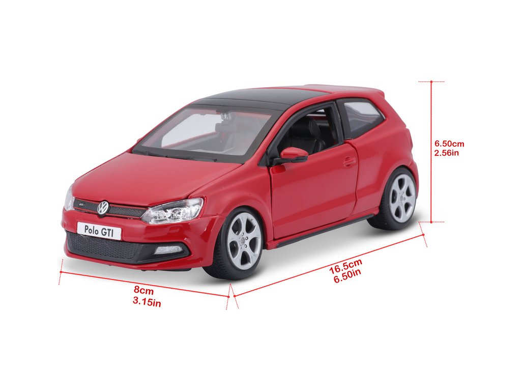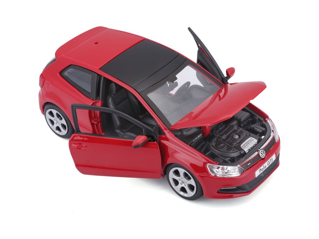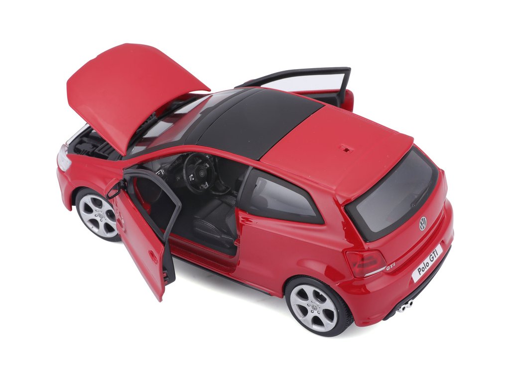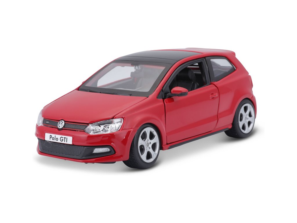 Kovový model auta 1:24 Bburago 18-21059 Plus VW Polo GTI Mark 5, nejen pro sběratele. Má otevírací dveře a kapotu, natáčení kol volantem je plně funkční. Barva modelu je červená metalíza a je přibližně 16 cm velký.