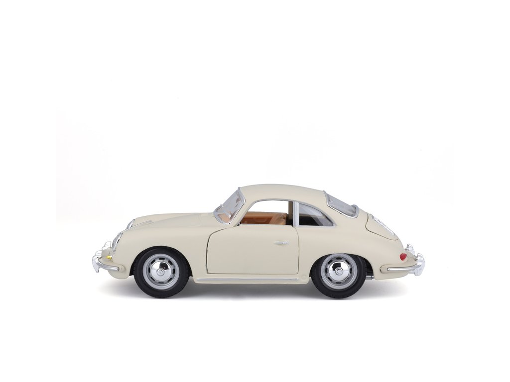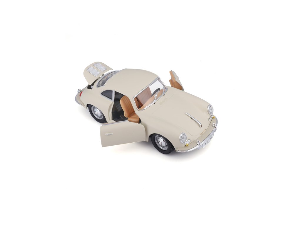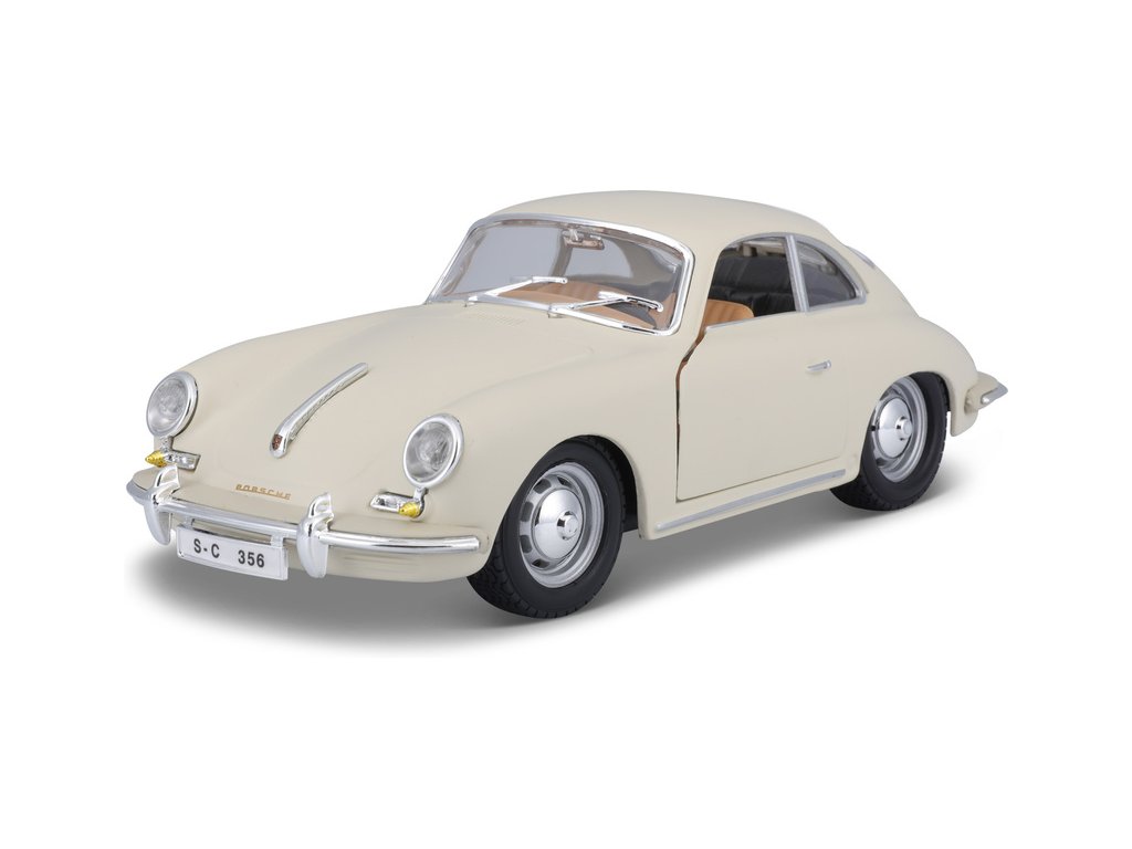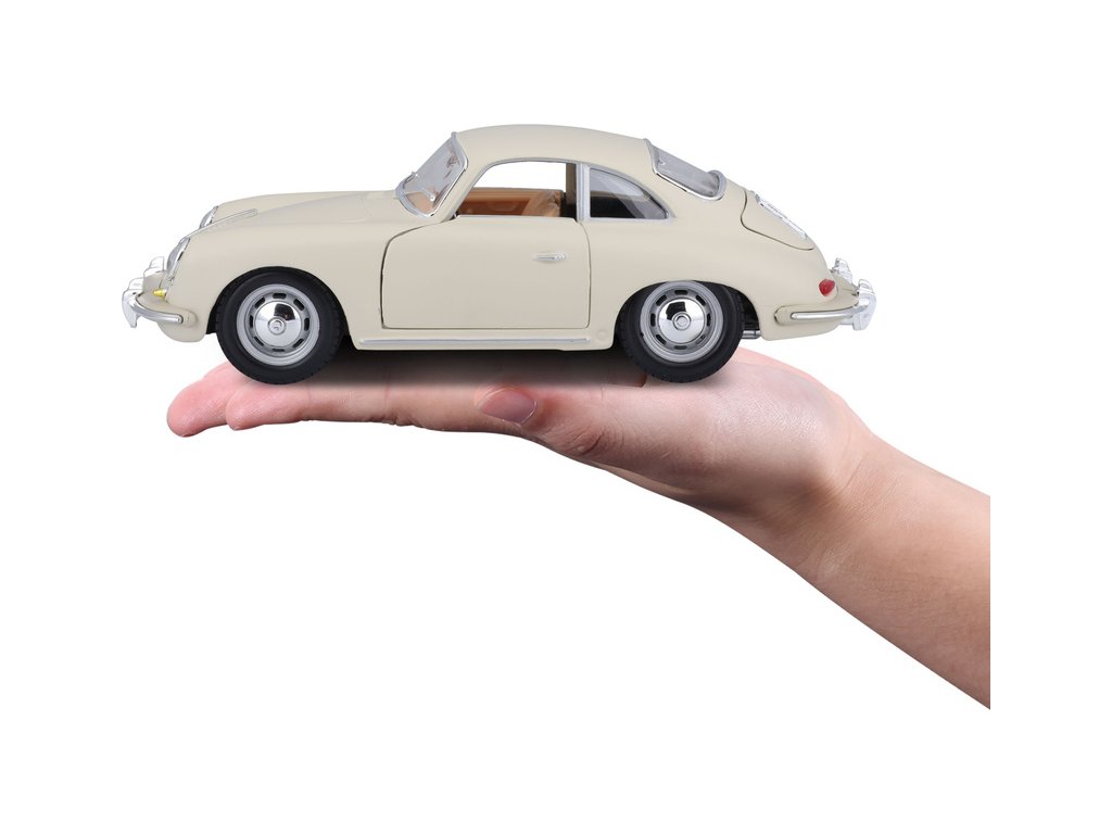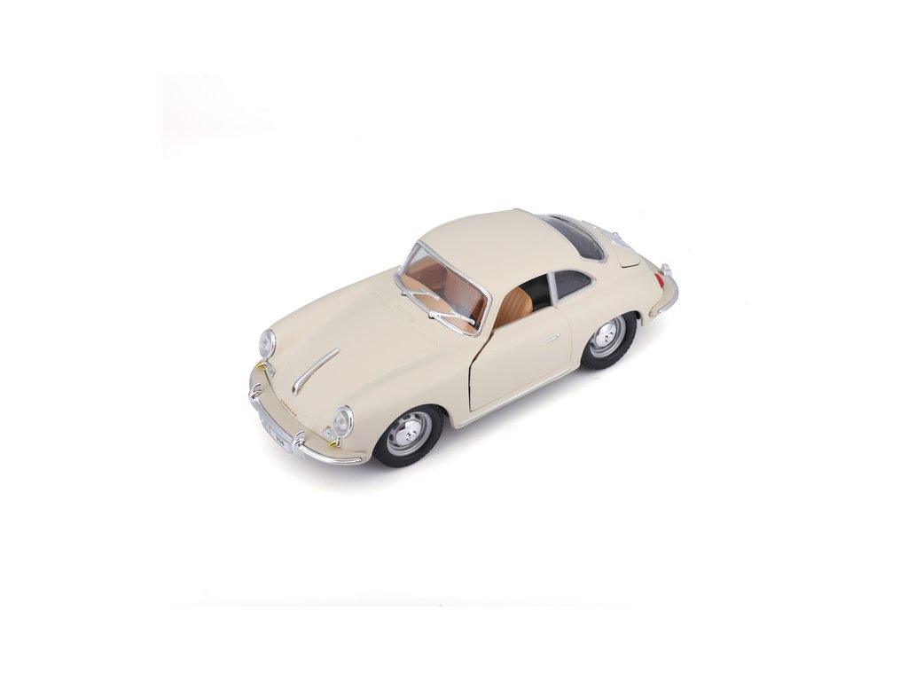 Kovový model auta 1:24 Bburago 18-22079 Porsche 356B Coupe (1961) nejen pro sběratele. Má otevírací dveře a kapotu, natáčení kol volantem je plně funkční. Barva modelu je krémová a je přibližně 18 cm velký.