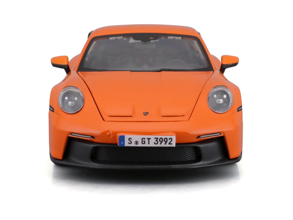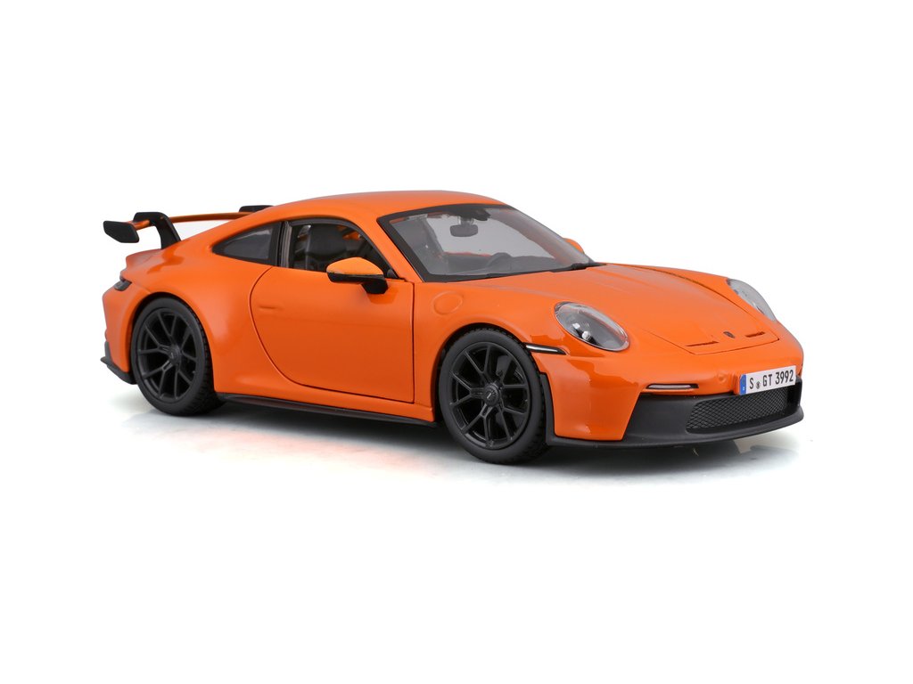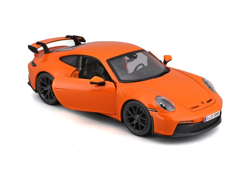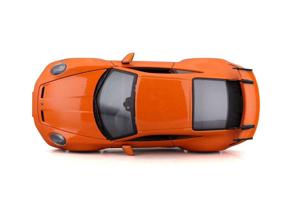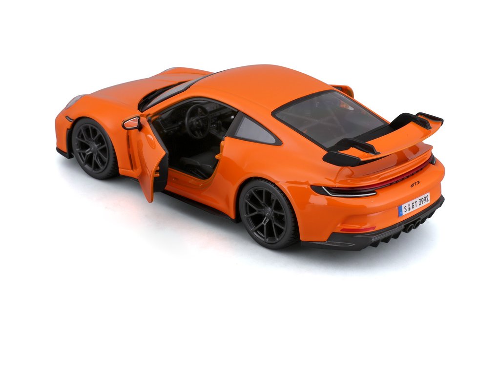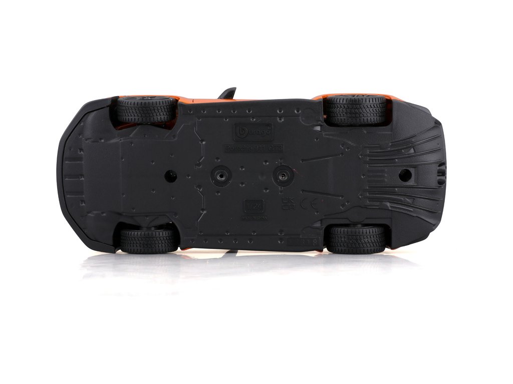 Kovový model auta 1:24 Bburago 18-21104 Porsche 911 GT3 nejen pro sběratele. Má otevírací dveře, barva modelu je oranžová a je přibližně 19 cm velký.