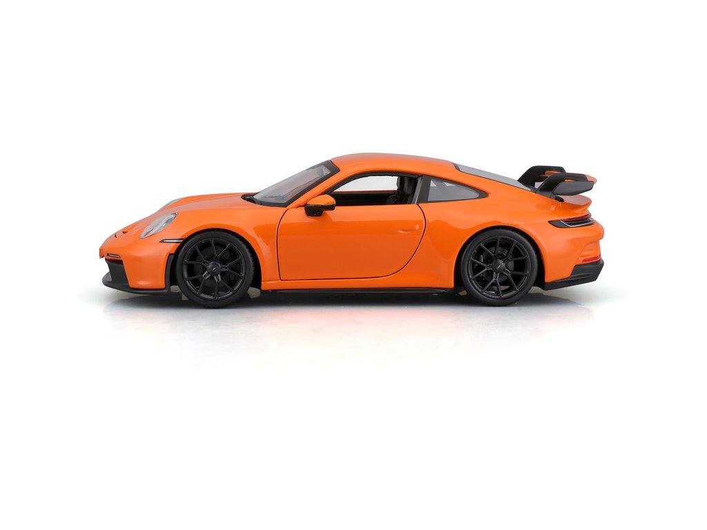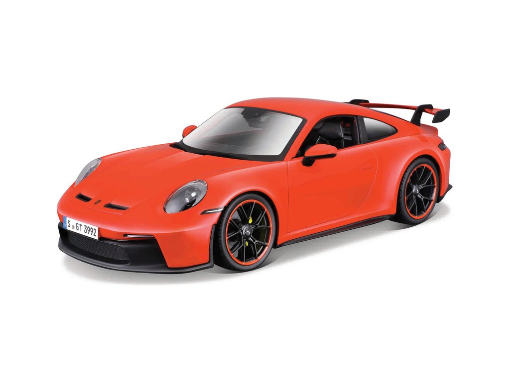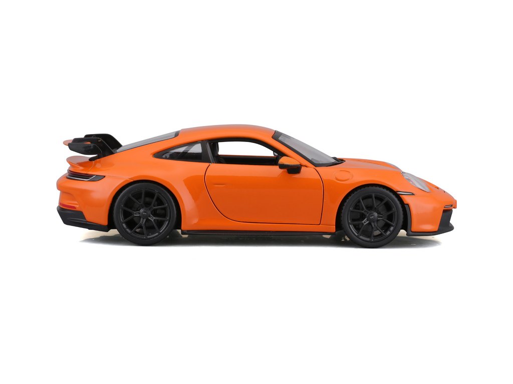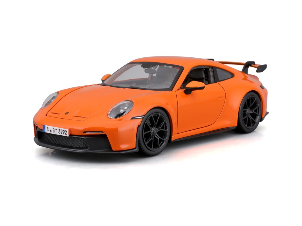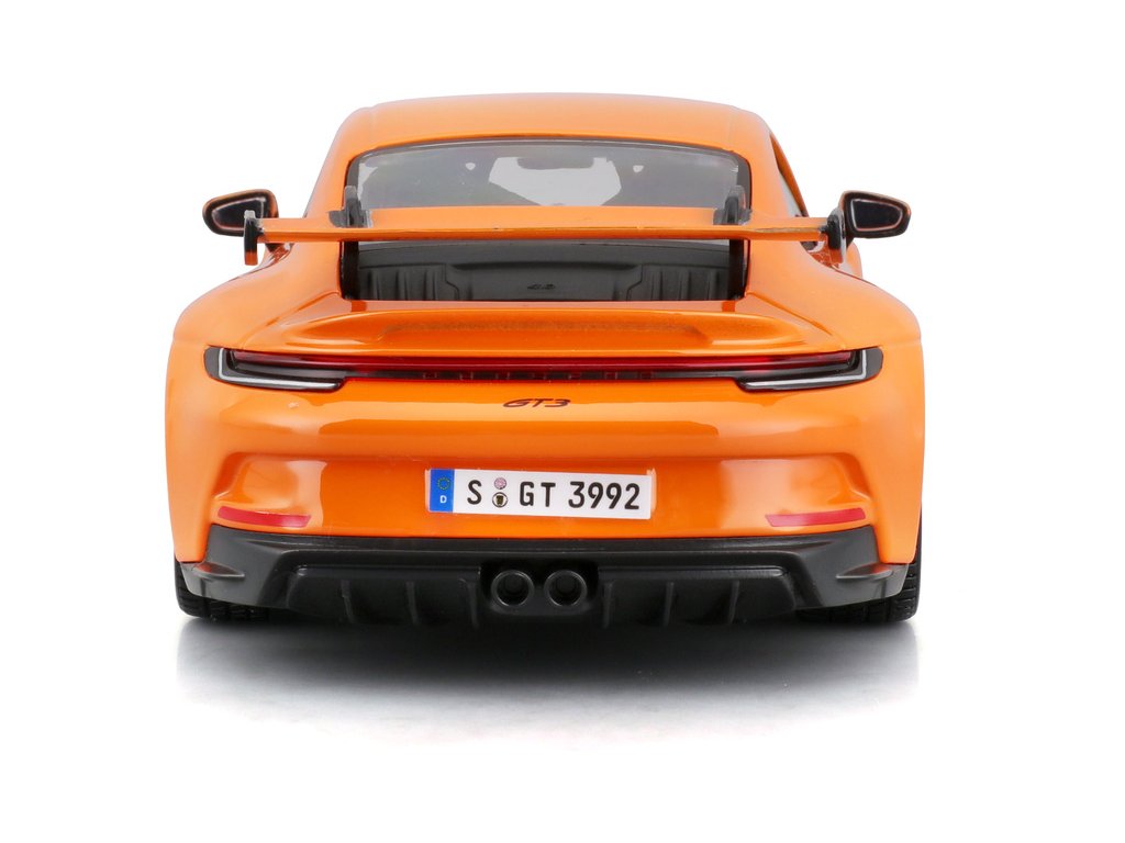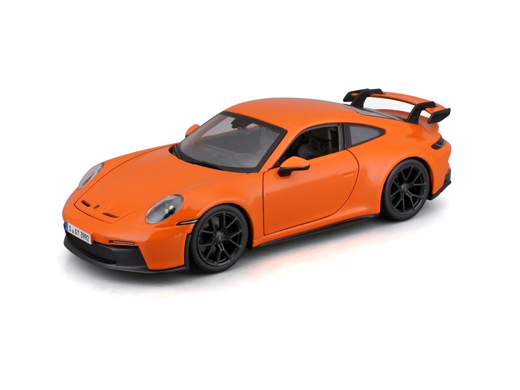 Kovový model auta 1:24 Bburago 18-21104 Porsche 911 GT3 nejen pro sběratele. Má otevírací dveře, barva modelu je oranžová a je přibližně 19 cm velký.