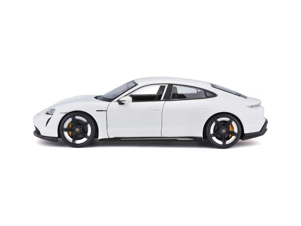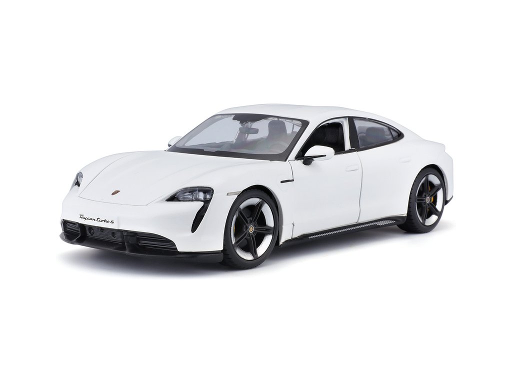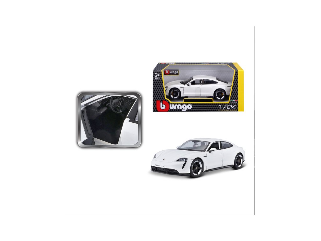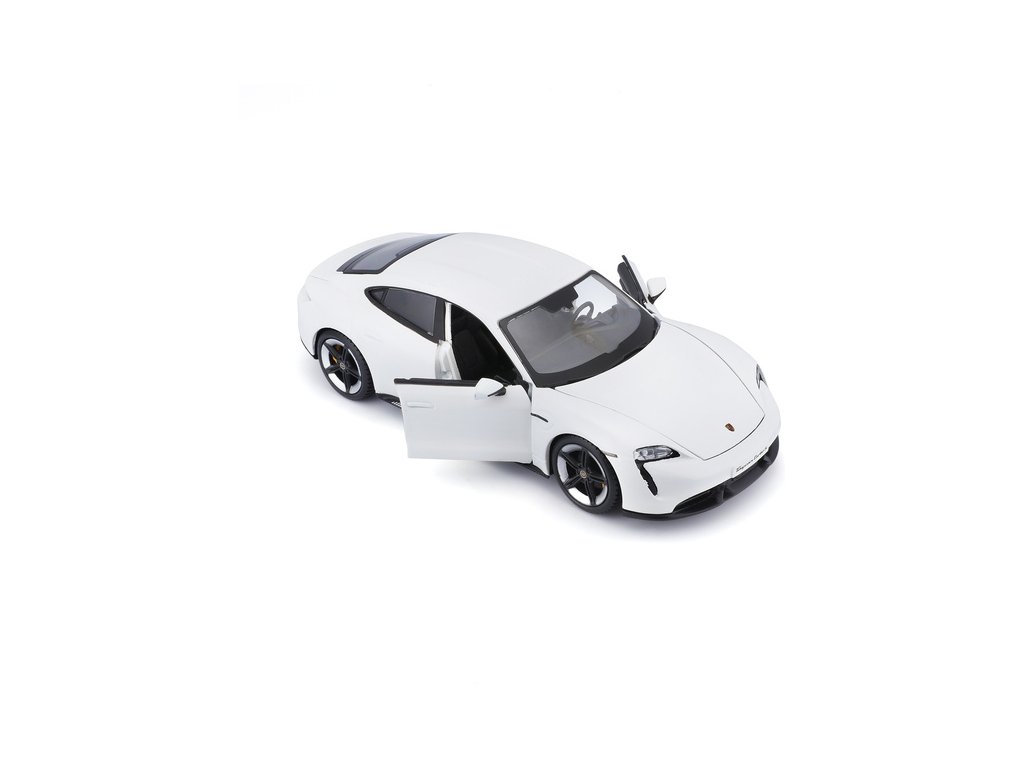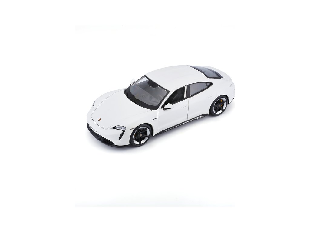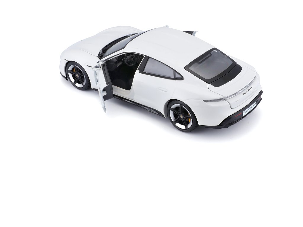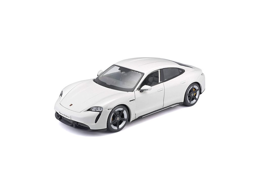 Kovový model auta 1:24 Bburago Plus 18-21098 Porsche Taycan Turbo S 2019 Carrara nejen pro sběratele. Má otevírací dveře a kapotu, natáčení kol volantem je plně funkční. Barva modelu je bílá a je přibližně 18 cm velký.