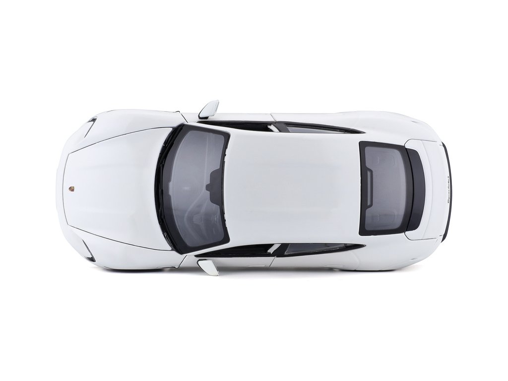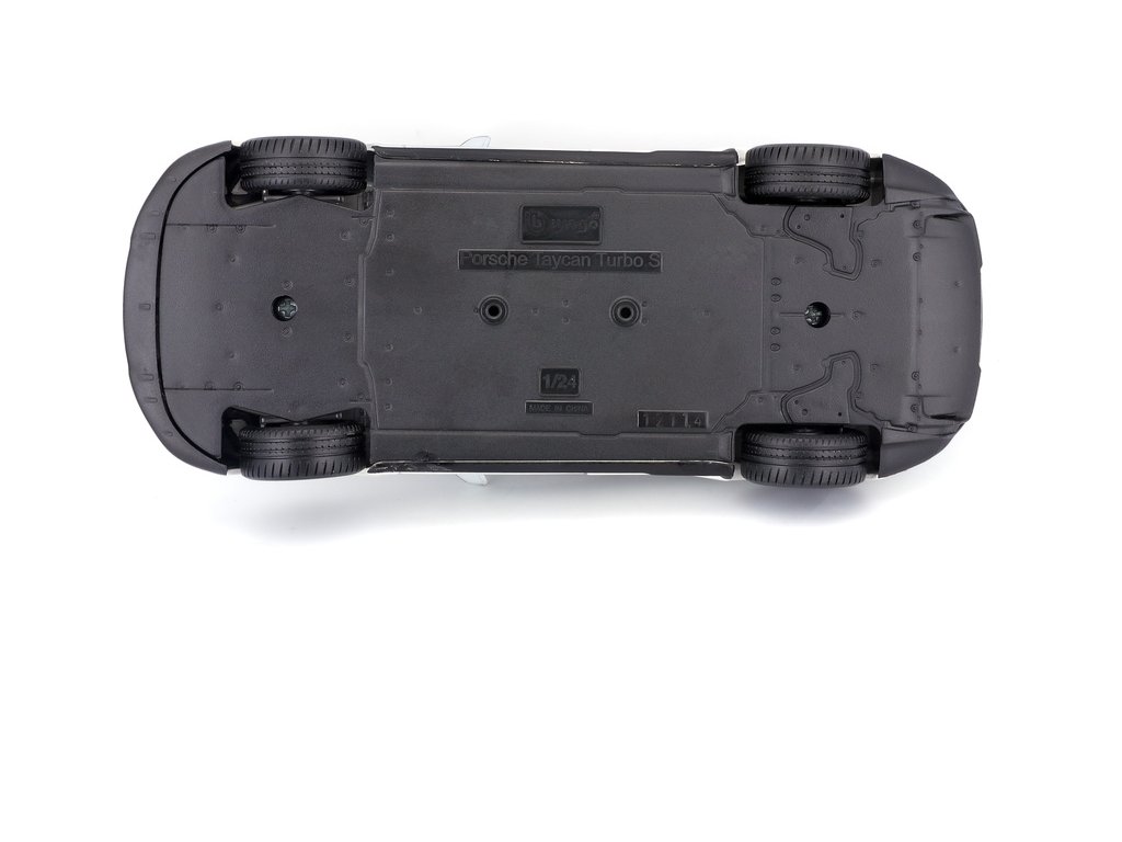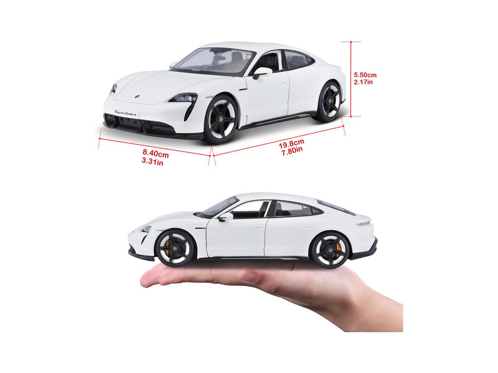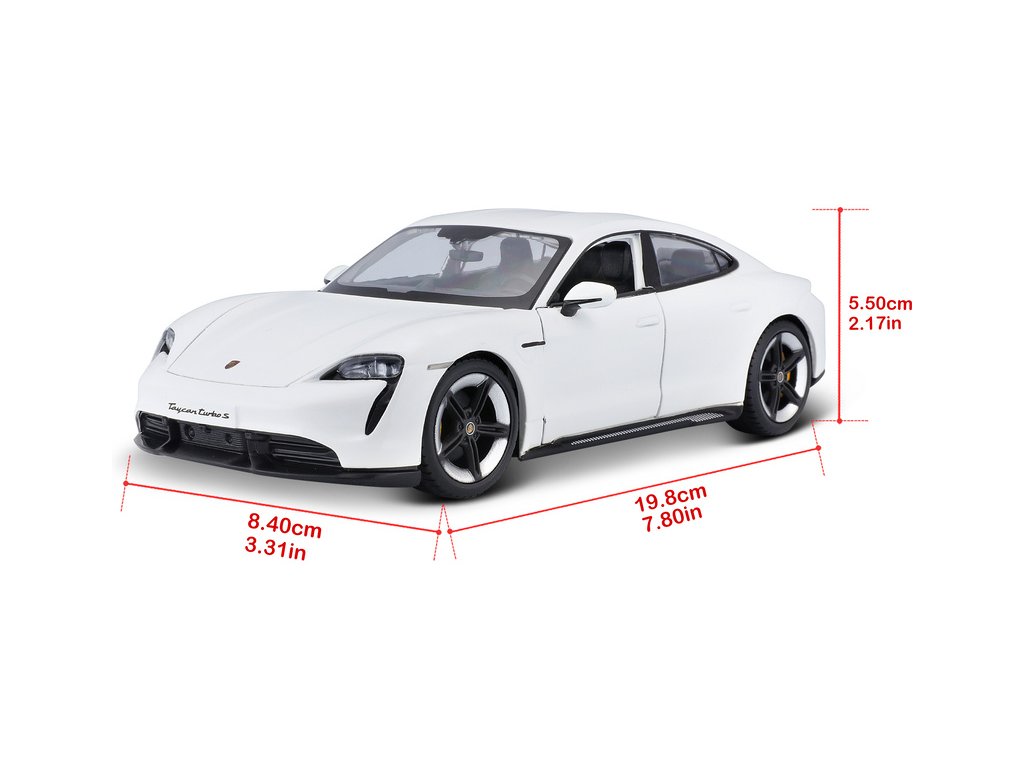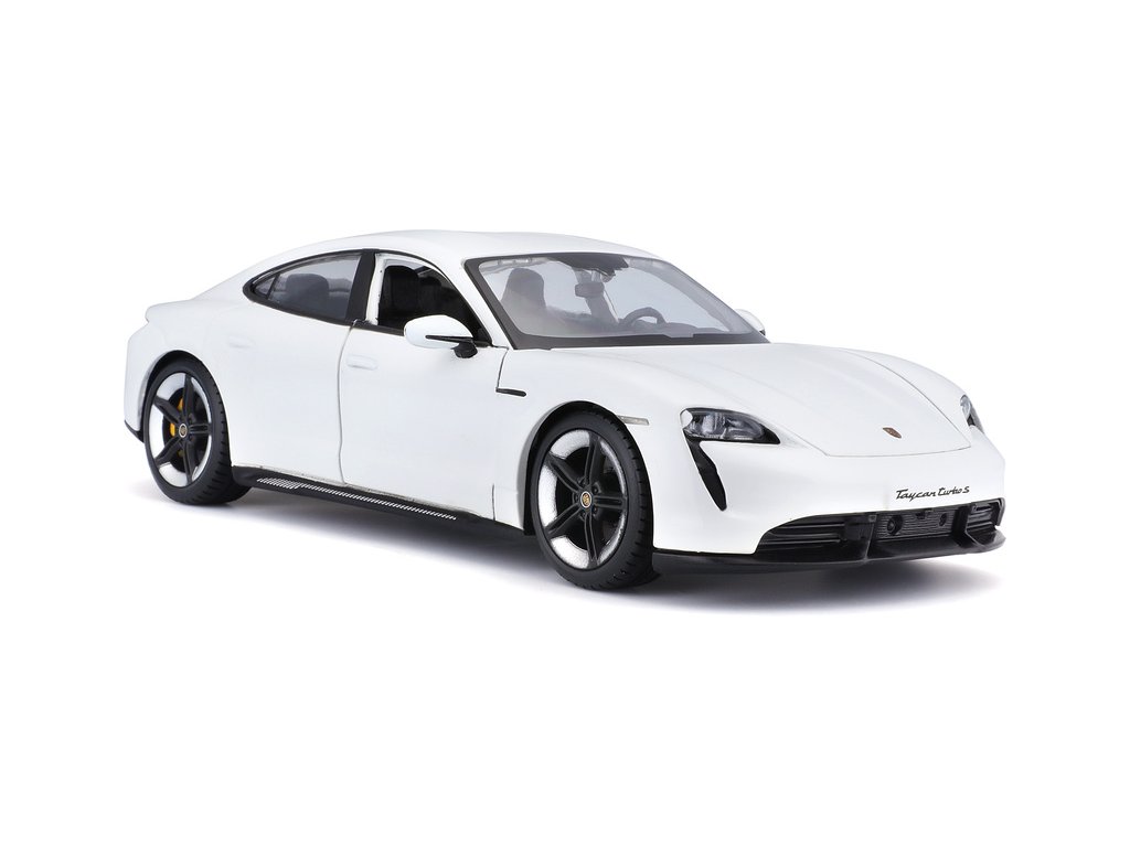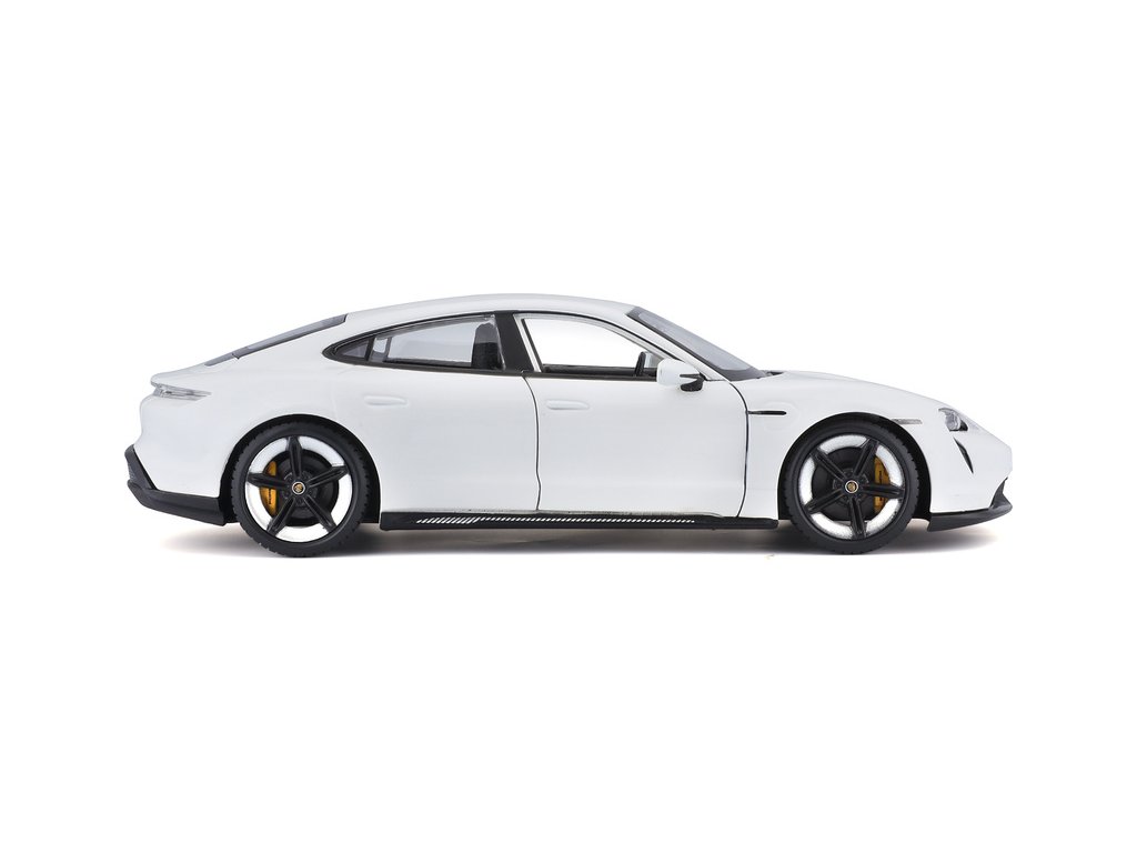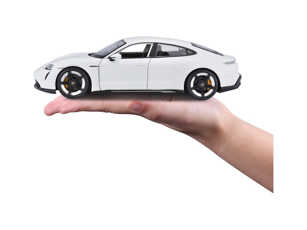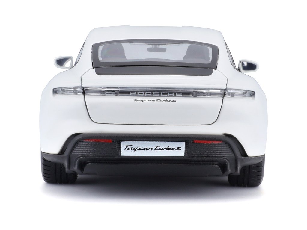 Kovový model auta 1:24 Bburago Plus 18-21098 Porsche Taycan Turbo S 2019 Carrara nejen pro sběratele. Má otevírací dveře a kapotu, natáčení kol volantem je plně funkční. Barva modelu je bílá a je přibližně 18 cm velký.