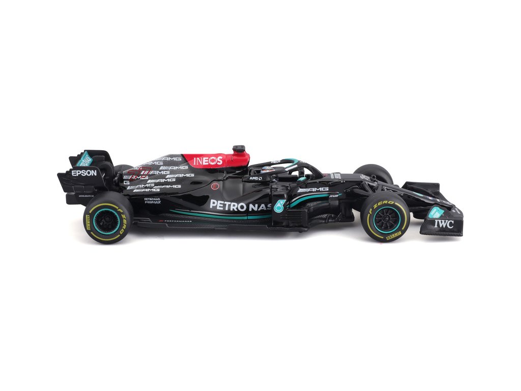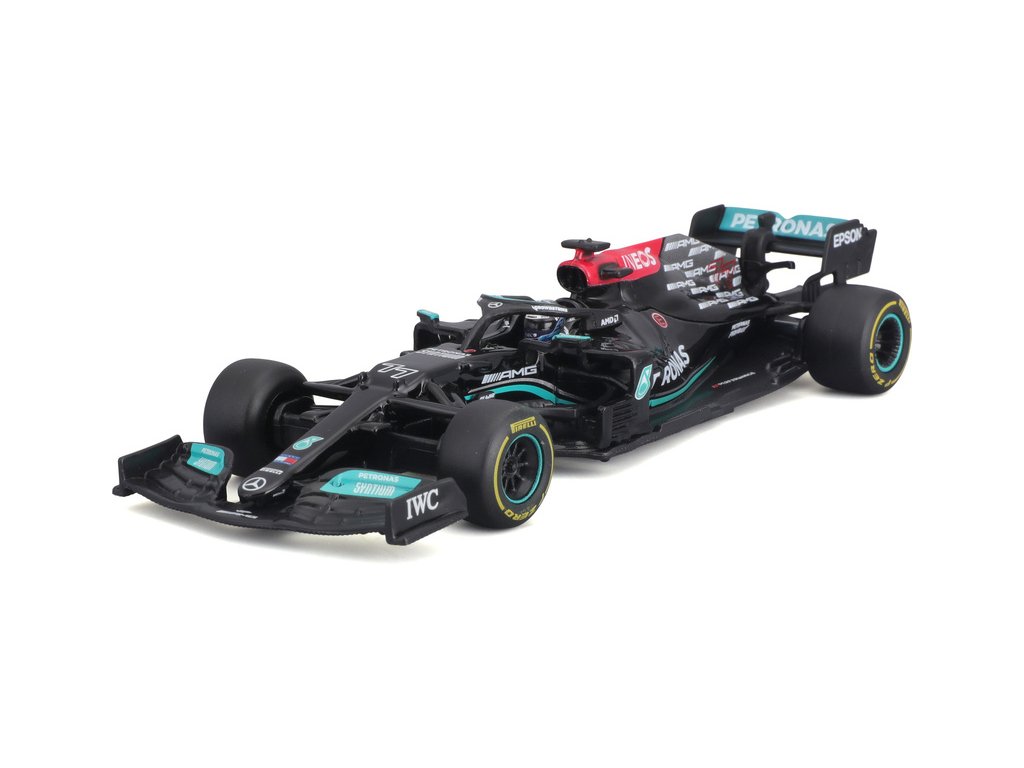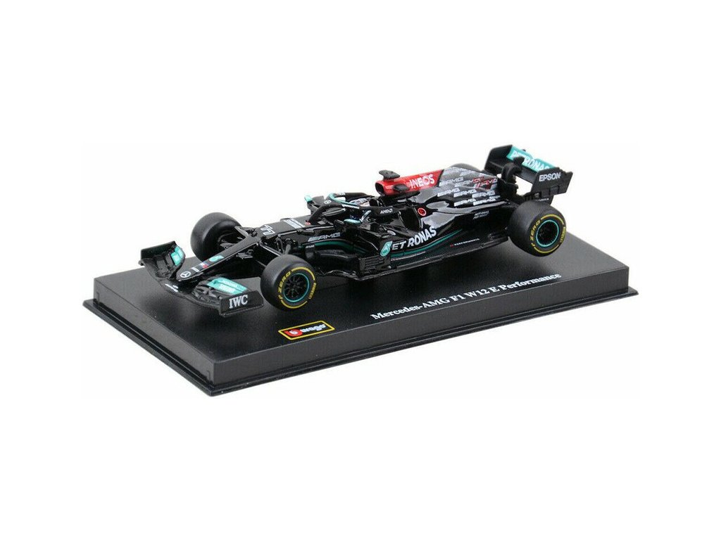 Kovový model v měřítku 1:43 Bburago 18-36038 Mercedes-AMG F1 W12 E Performance je dodáván v průhledné plastikové krabičce. Barva modelu je černá, pilot #77 Valtteri Bottas.