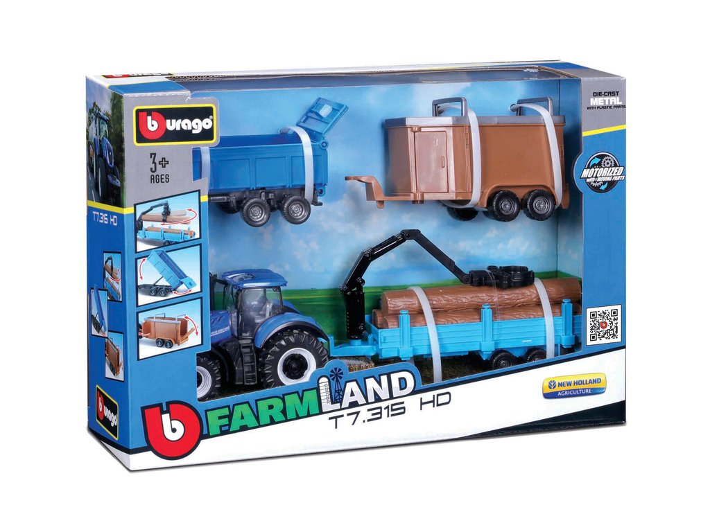 Sada dárkově balených 6 modelů zemědělské techniky Bburago 18-31668 Fendt 1050 Vario, Massey Ferguson a New Holland T7.315 s nakladači. Velikost traktoru je přibližně 10 cm, barva modelů je zelená, červená a modrá a jsou na setrvačník. Jsou vyrobeny z plastových dílků.