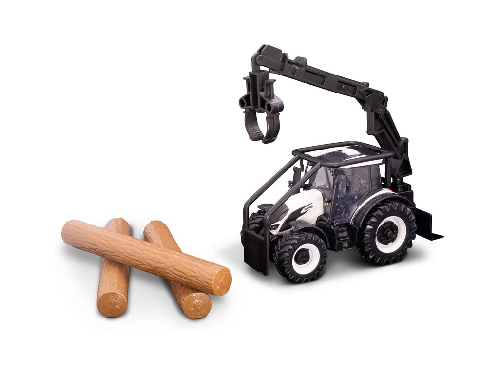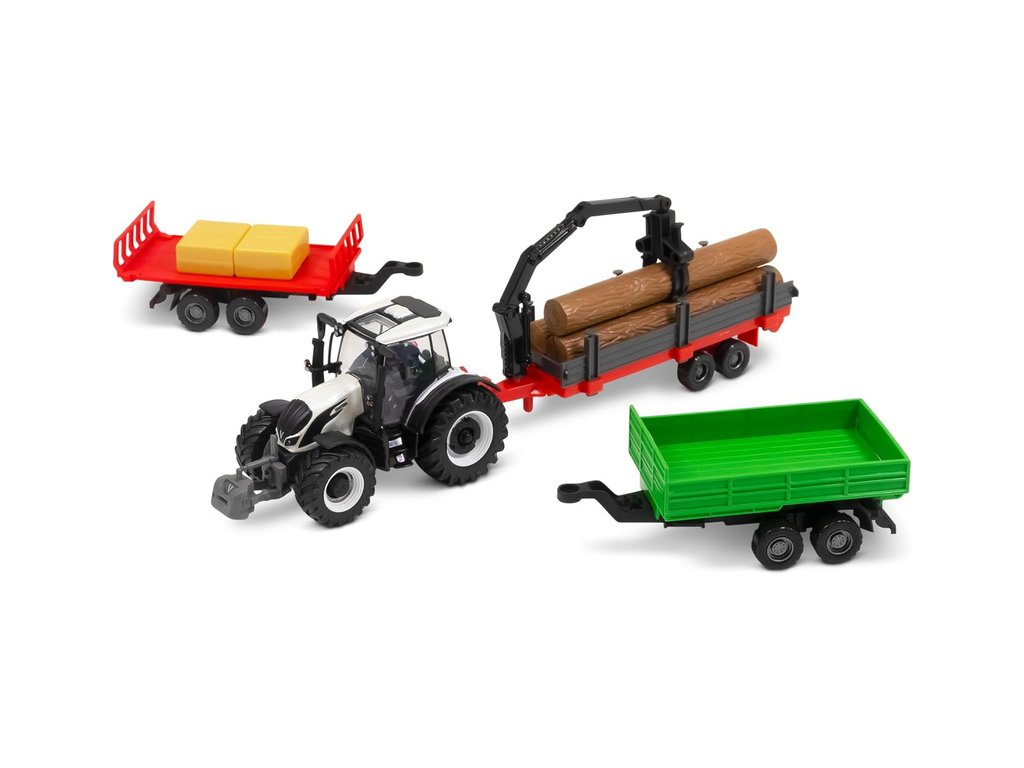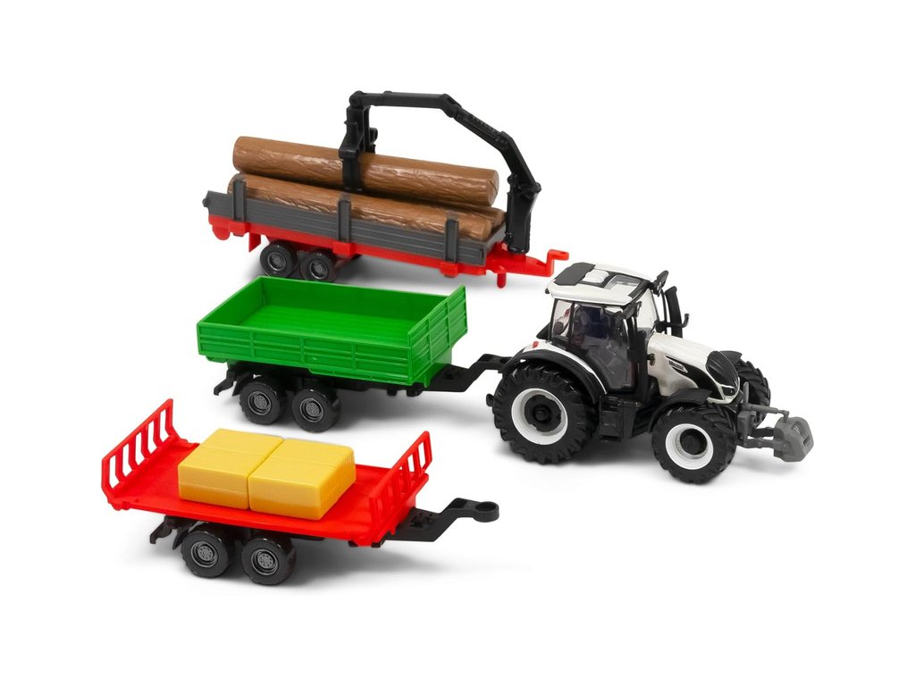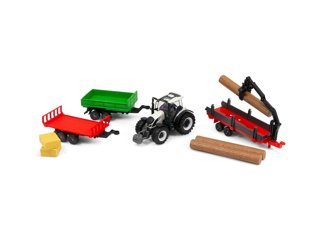 Model zemědělského traktoru Bburago 18-31668V - Valtra N174 s doplňky. Je vyroben z plastových dílů. Model má pryžové kolečka na setrvačník, odjímatelnou kabinu. Traktor s přívěsem je přibližně 26 cm velký.