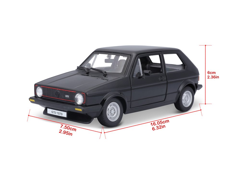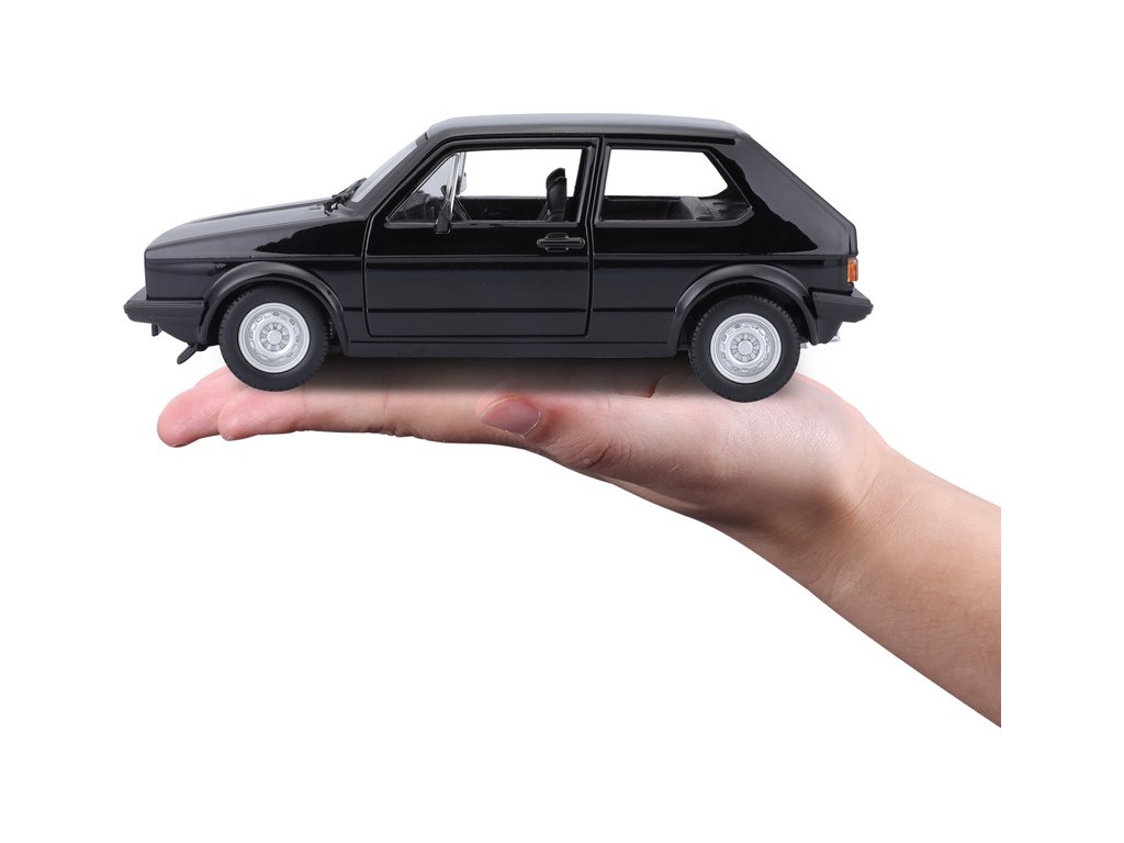 Kovový model auta v měřítku 1:24 Bburago 18-21089 Volkswagen Golf MK1 GTI, nejen pro sběratele. Má otevírací dveře a je v detailním provedení. Barva modelu je černá.