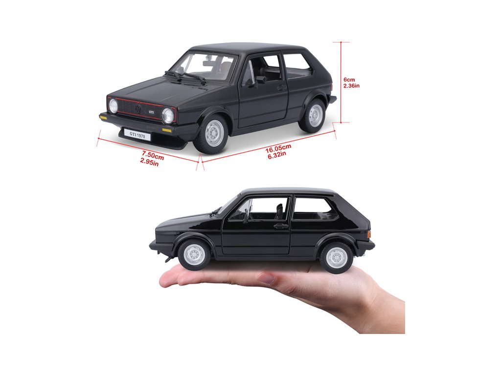 Kovový model auta v měřítku 1:24 Bburago 18-21089 Volkswagen Golf MK1 GTI, nejen pro sběratele. Má otevírací dveře a je v detailním provedení. Barva modelu je černá a je přibližně 16 cm velký.