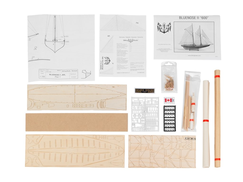 Bluenose má trup klasické dřevěné konstrukce z laserem vyřezávaných dílů s plaňkovanou obšívkou a dřevěnou palubu. Stavebnice obsahuje všechny dřevěné a plastové díly potřebné pro dokončení modelu, maketové příslušenství, plachty atd.