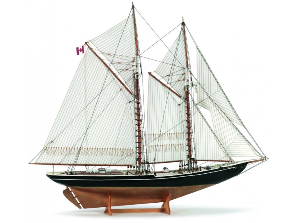 Dvoustěžňový škuner Bluenose byl spuštěn na vodu v Lunenburgu v kanadském státě Nové Skotsko (Nova Scotia) 26. března 1921 a původně byl určen pro rybolov v drsných vodách při pobřeží Newfoundlandu. Velmi brzy se ale ukázalo, že se podařilo vytvořit neuvěřitelně rychlou loď, která začala pod velením kapitána Anguse Walterse sbírat vítězství ve všech regatách podél východního pobřeží USA a Kanady. Představte si to – obyčejná rybářská loď se stala nejrychlejší jachtou! Její sláva se šířila, dostala se na mince i poštovní známky, ve znaku ji měla 434. eskadra Kanadského královského letectva a její siluetu najdete na poznávacích značkách aut v Novém Skotsku! Kariéra Bluenose skončila roku 1946 po ztroskotání u břehů Haiti, ale loď nebyla zapomenuta. V roce 1964 byla na vodu spuštěna její přesná replika Bluenose II, která brázdila vody až do roku 2010 – a poté byla nahrazena nově postavenou lodí stejného jména spuštěnou na vodu roku 2013. Bluenose II se z úcty k původnímu plavidlu neúčastní žádných soutěží, ale je ozdobou všech regat, na které zavítá a slouží jako oficiální „velvyslanec“ Nového Skotska. Škuner Bluenose II je určen pro mírně pokročilé lodní stavitele; je konstruován jako neplovoucí stolní maketa.
