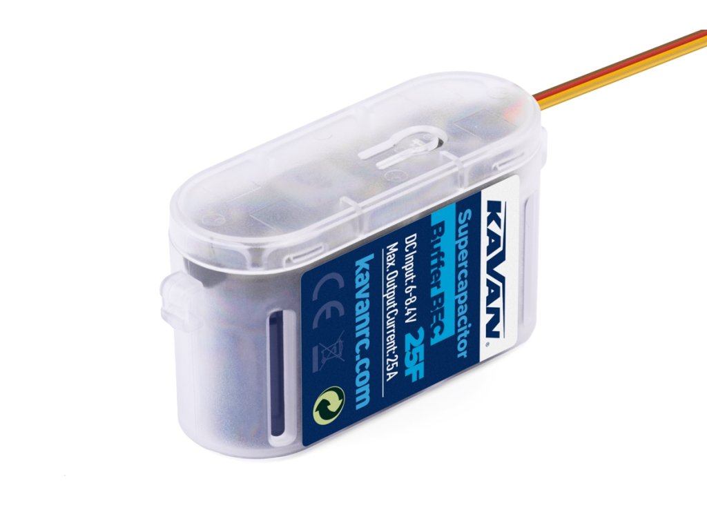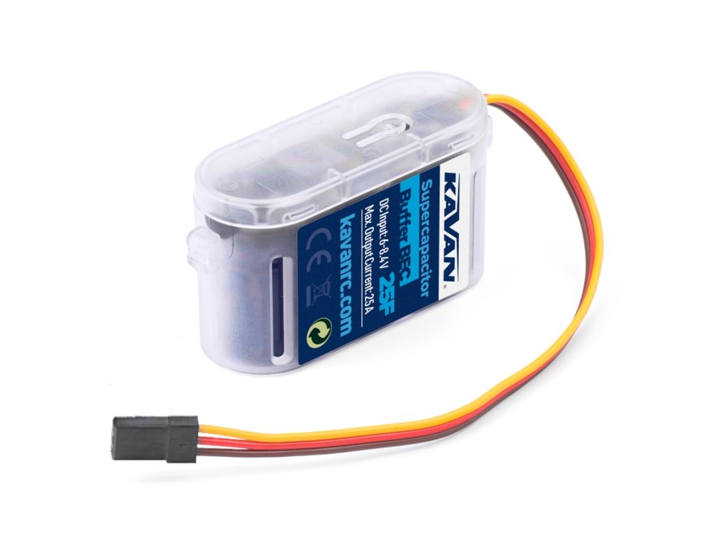 Filtrační superkondenzátor 25 F/6–8,4 V/max. 25 A pro filtrování napájecího napětí palubní elektroniky RC modelů. Kondenzátor s extrémně vysokou kapacitou umožňuje vyrovnávat krátkodobé odběrové špičky, které by jinak způsobily pokles napájecího napětí přijímače (s rizikem jeho vysazení).