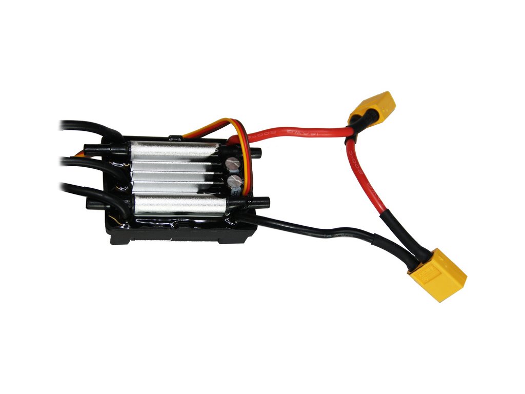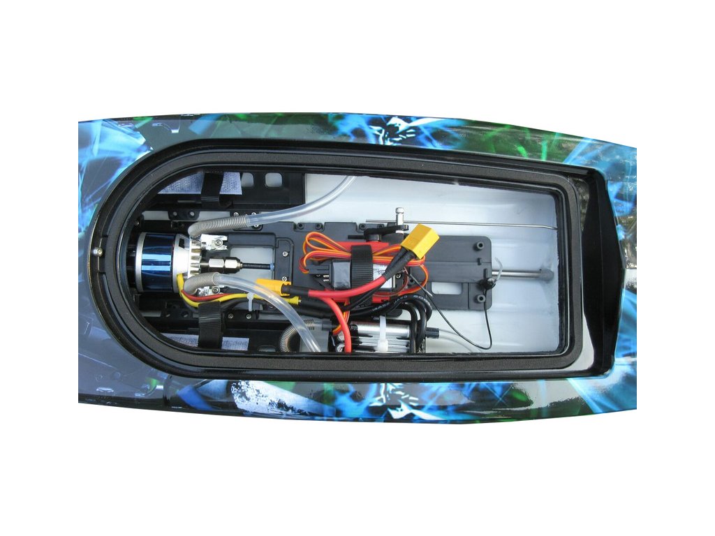 Všechny komponenty elektroniky jsou nainstalovány v trupu lodi. V přední části je motor, na pravé straně baterie a na levé straně je umístěn regulátor. Ve středové části pak přijímač a servo.