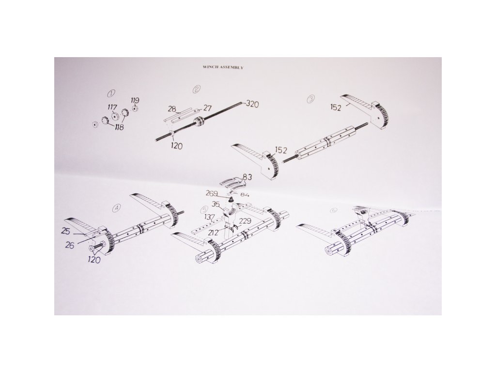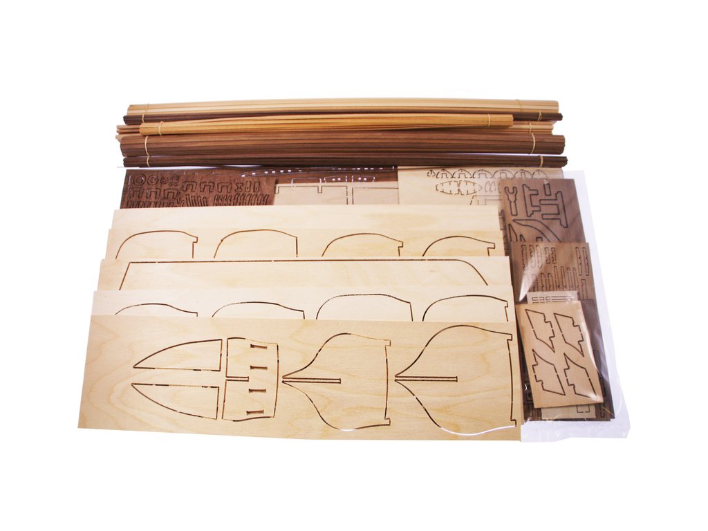 Po otevření víka krabice naleznete dřevěné díly modelu z překližky, sadu lišt, drobné součásti uzavřené v sáčcích, sadu výkresů a manuál.