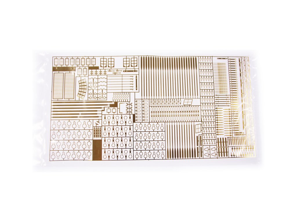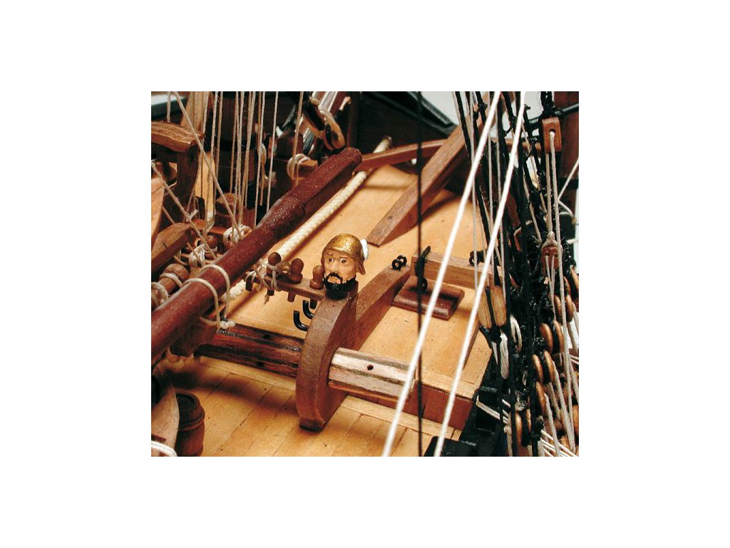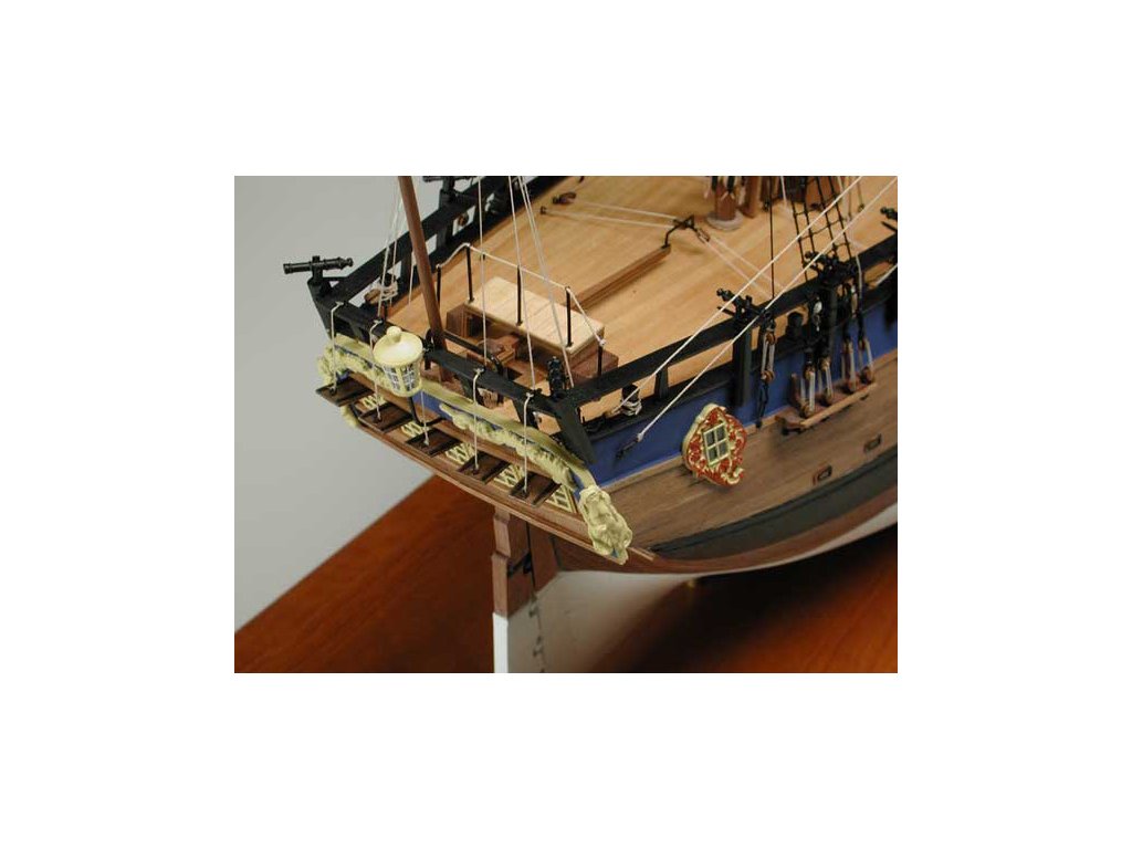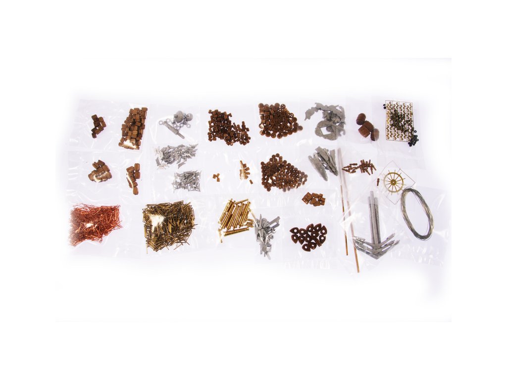 Sada obsahuje vyfrézované díly z překližky na CNC, součásti z lípy a ořechového dřeva, kování z leptané a soustružené mosazi, ozdoby z litého kovu, lanoví z přírodní a černé příze, sada čtyř člunů v konstrukci rámu, podrobné stavební plány a stručnou příručku v německém jazyce.