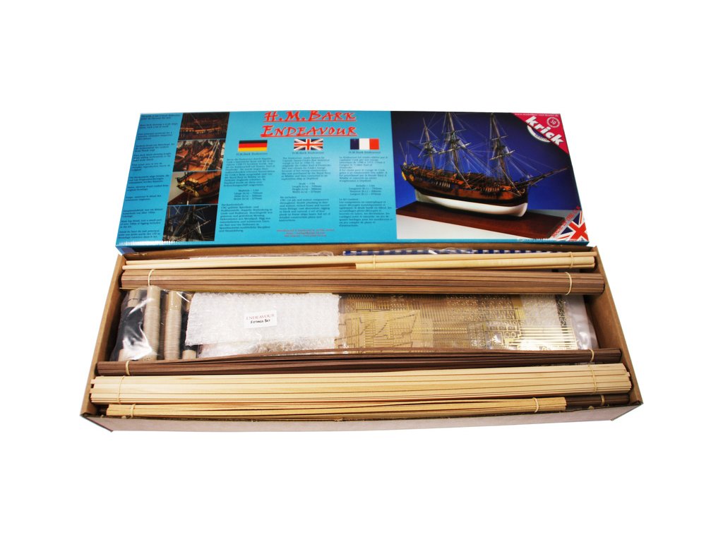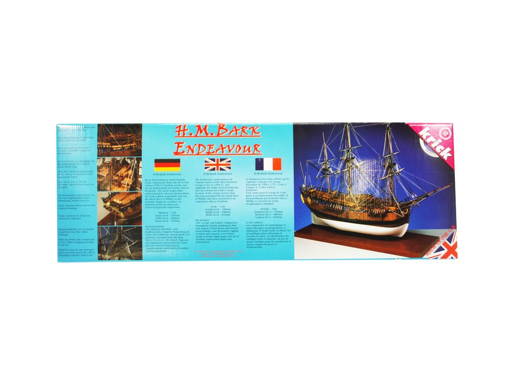 Stavebnice modelu lodi CALDERCRAFT Endeavour H.M. Bark 1767 1:64 pro zkušené stavitele. Velký důraz byl kladen na co největší věrnost originálu a díky spolupráci s Britským námořním muzeem má špičkové podklady. Set obsahuje díly z překližky, ořechového a lipového dřeva a velké množství doplňků.
