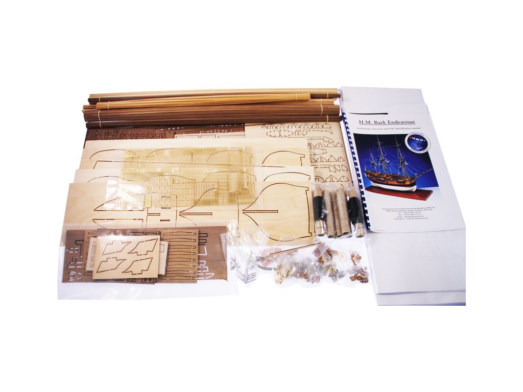 Balení obsahuje stavebnici CALDERCRAFT Endeavour H.M. Bark 1767 1:64 kit. Balení obsahuje sadu překližkových dílů, sadu dřevěných lišt o různém průřezu, sáčky s drobnými díly, díly z mosazi, sadu výkresů a vícejazyčný manuál.
