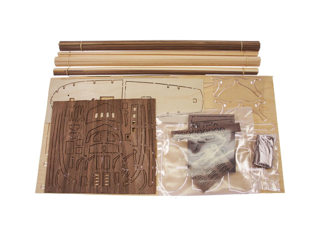 Po otevření víka krabice naleznete dřevěné díly modelu z překližky, sadu lišt, drobné součásti uzavřené v sáčcích, sadu výkresů a manuál.