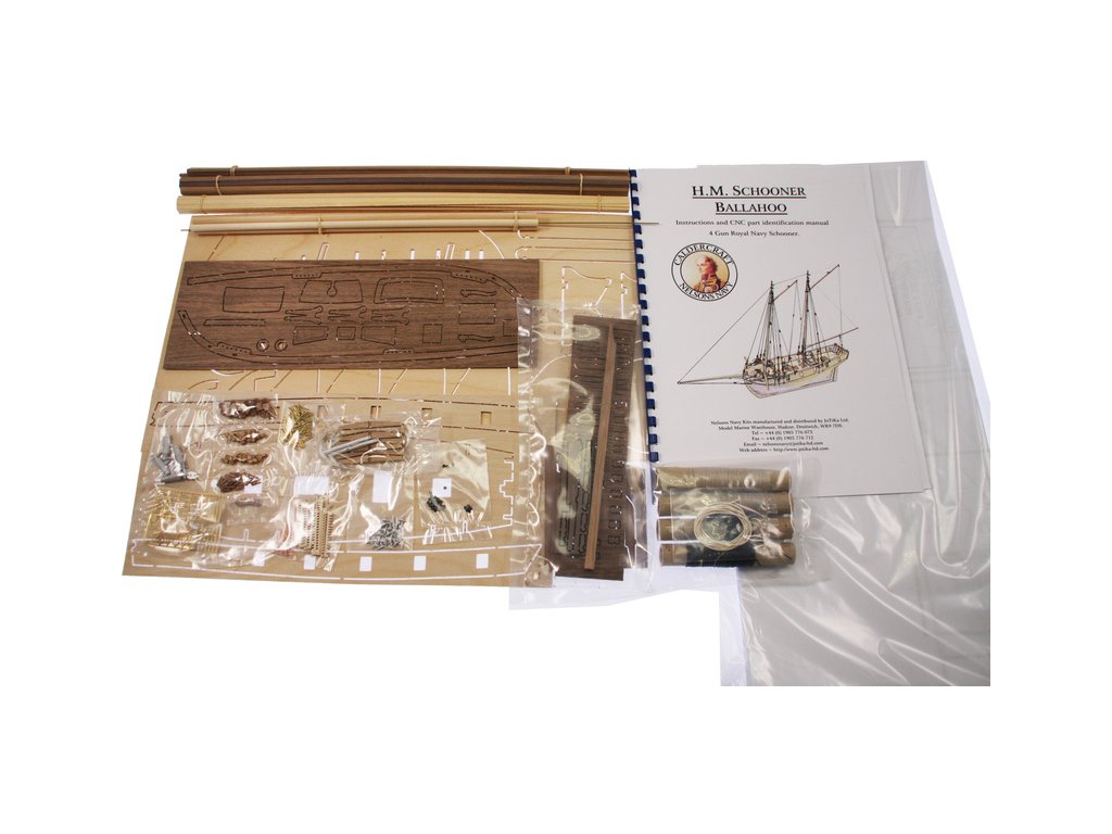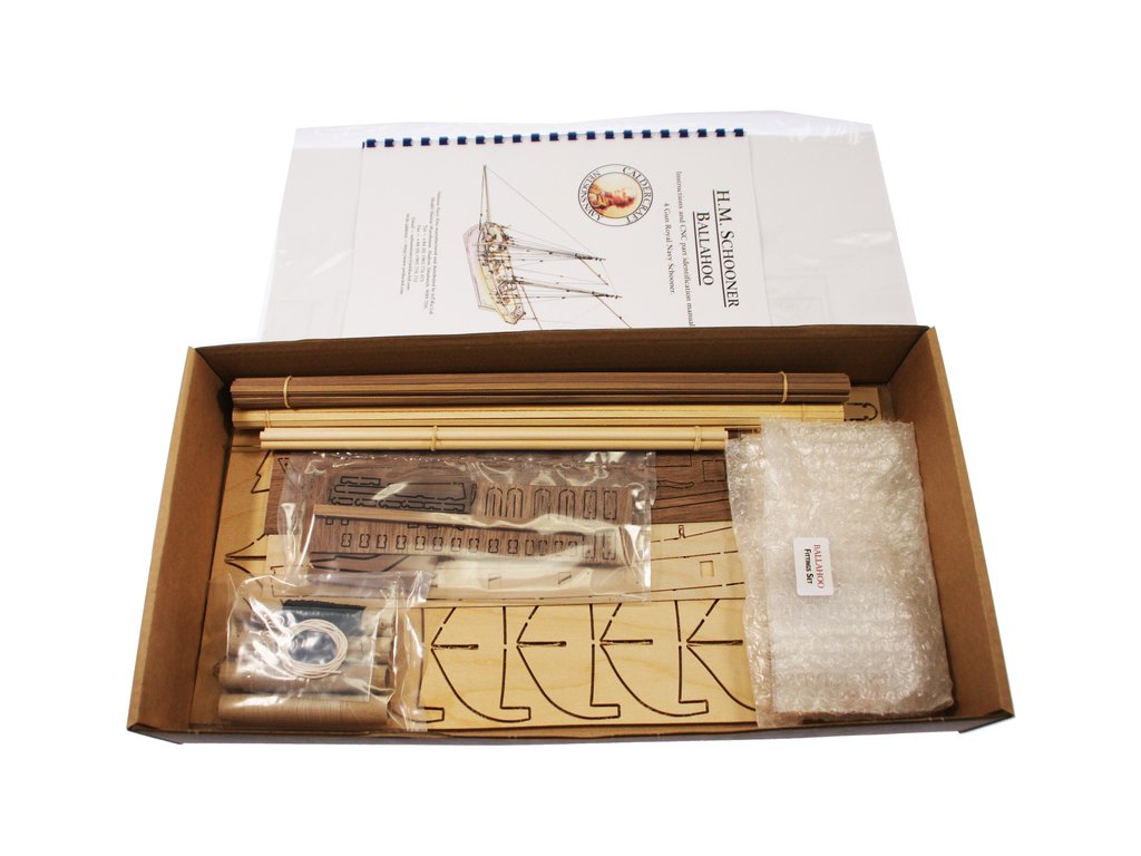 Obsahem balení je stavebnice lodi CALDERCRAFT H.M Ballahoo škuner 1803 1:64 kit. Balení obsahuje sadu překližkových dílů, sadu dřevěných lišt o různém průřezu, sáčky s drobnými díly, díly z mosazi, sadu výkresů, návod CZ a vícejazyčný manuál.