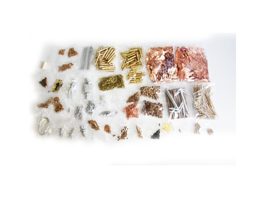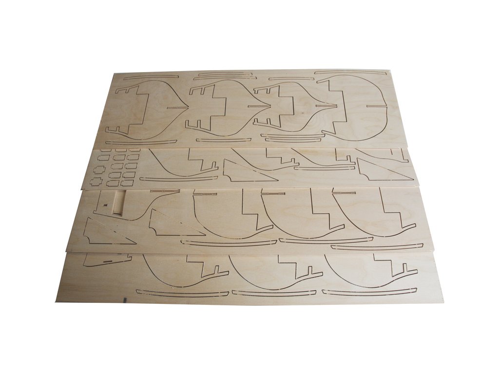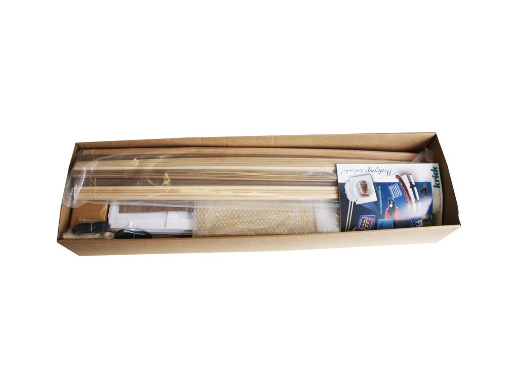 Po otevření víka krabice naleznete dřevěné díly modelu z překližky, sadu lišt, drobné součásti uzavřené v sáčcích, sadu výkresů a manuál.
