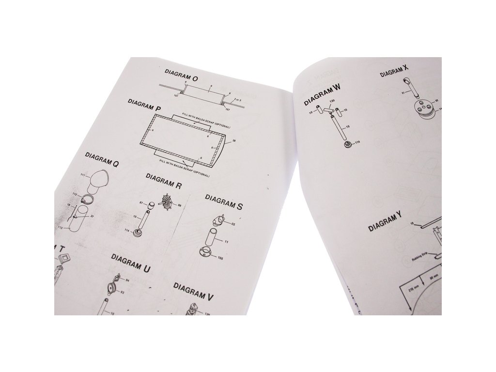 Set obsahuje kompletní sadu výkresové dokumentace modelu v měřítku 1:1 s postupem stavby, na výkrese jsou pečlivě označeny díly a je zde i seznam jednotlivých součástí modelu.