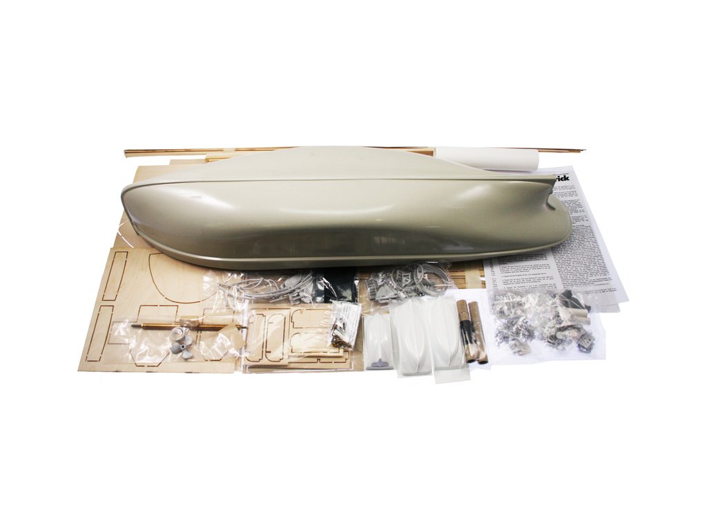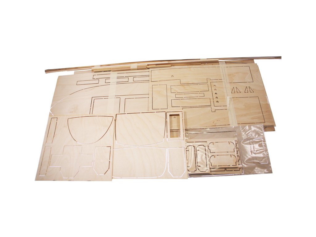 Po otevření víka krabice naleznete laminátový trup, dřevěné díly modelu z překližky, sadu lišt, drobné součásti uzavřené v sáčcích, sadu výkresů a manuál.