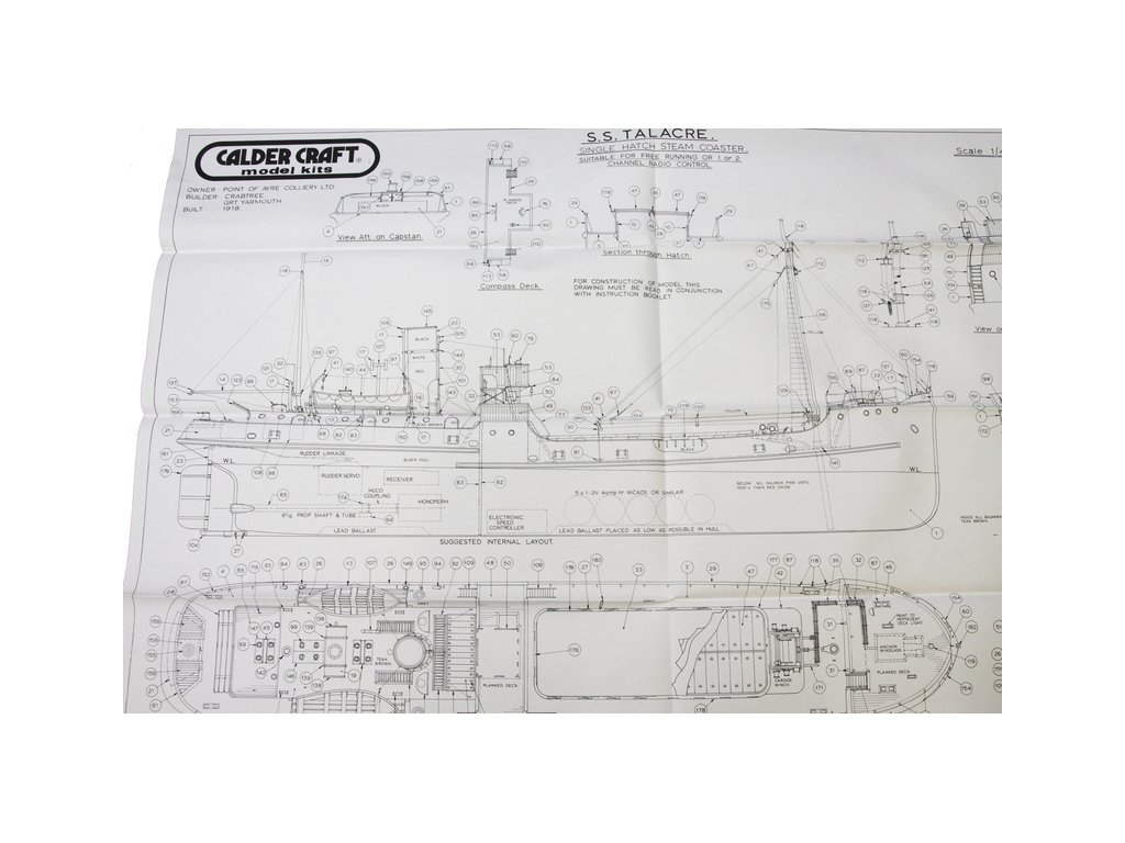 Stavebnice modelu lodi CALDERCRAFT S.S. Talacre z roku 1917 v měřítku 1:48.Předloha je typická pobřežní nákladní loď. Při stavbě makety máte k dispozici detailní laminátový trup do kterého můžete vestavět pohon a RC vybavení k plavbě na vodě. K pohonu můžete zvolit vhodný parní stroj nebo elektro pohon. Stavebnice obsahuje spoustu součástí, které přesně odpovídají detailům skutečné lodi. Překližkové díly jsou přesně vyfrézovány na CNC, k dispozici je spousta příslušenství, stavební plány.