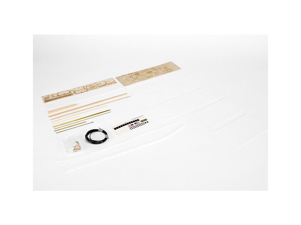 Stavebnice obsahuje: vakuové výlisky trupu, laserem vyřezávané balsové a překližkové díly, desk z mikropěnového PVC s předseknutými díly, smrkové a plastové nosníky a tyčinky, odlévané kovové díly a další maketové příslušenství, lodní hřídel s pouzdrem, dvoulistý lodní šroub 25 mm, sadu samolepek, výkres lodi v měřítku 1:1, obrázkový návod ke stavbě.