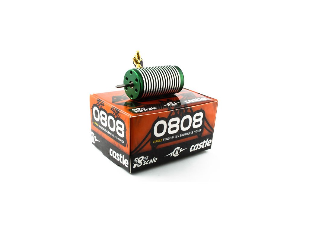 Závodní střídavý čtyřpólový motor Castle 0808 se 4100 ot/min/V představuje špičku mezi střídavými motory RC auta v měřítku 1:18. Malé rozměry ale brutální výkon a vysoká kvalita zpracování. Napájení až 2 až 3 čl. LiPol.