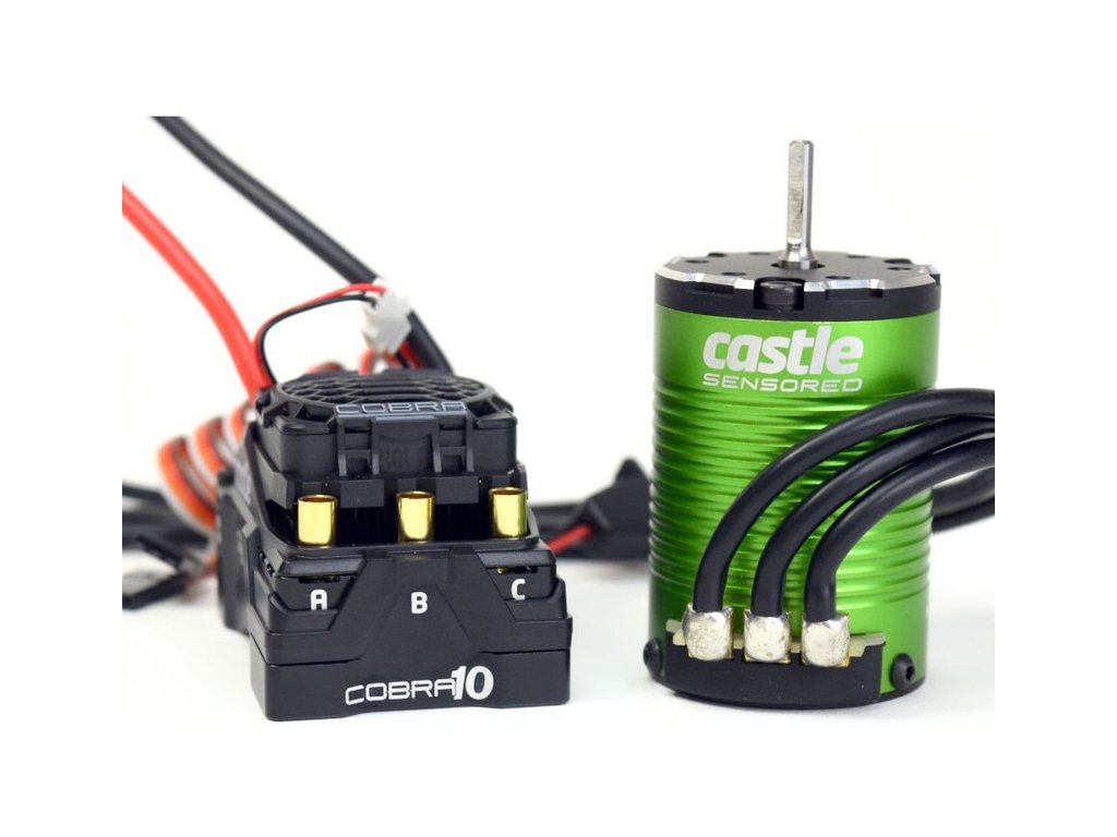 Výkonný regulátor otáček Castle Cobra 10 se střídavým senzorovým motorem 1406 7700ot/min/V, pro RC modely aut v měřítku 1:10 do hmotnosti 1.8 kg. Napájení 2S LiPo, BEC 5-8V (8A). Voděodolná konstrukce, doplňkový vstup pro změny během závodu, záznam naměřených dat. Technologie CRYO-DRIVE.