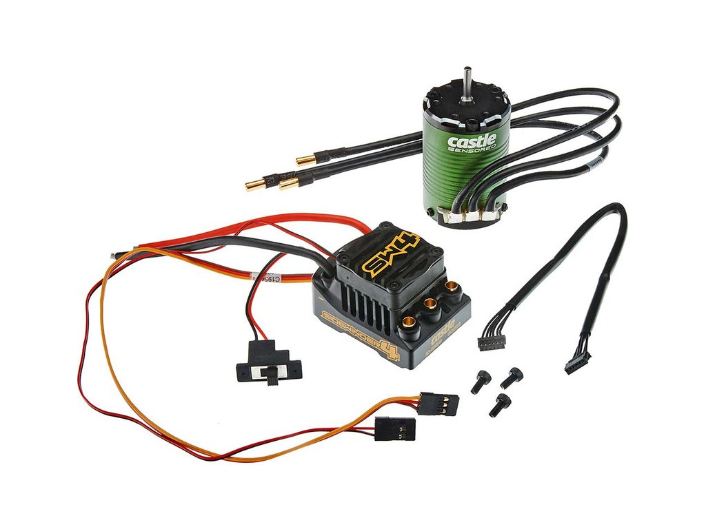 Střídavý senzorový motor Castle 1410 3800 ot/V s hřídelí 3.17 mm a regulátorem Castle Sidewinder 4 Cryo-Drive. Sada je určena pro 2WD/4WD Buggy, Truggy, Short Course nebo 2WD Monster Trucky.