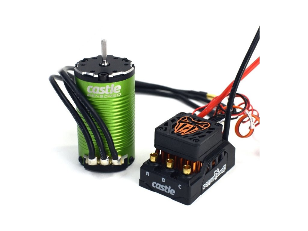 Výkonný regulátor Castle Copperhead se střídavým senzorovým motorem 1412 3200ot/V (hřídel 5mm), pro RC modely aut 1:10 do hmotnosti 3 kg. Voděodolná konstrukce, nastavitelný BEC až 6A, napájení 2S-4S LiPol, možnost nastavení, telemetrie S.BUS2, základní data log. Technologie CRYO-DRIVE.