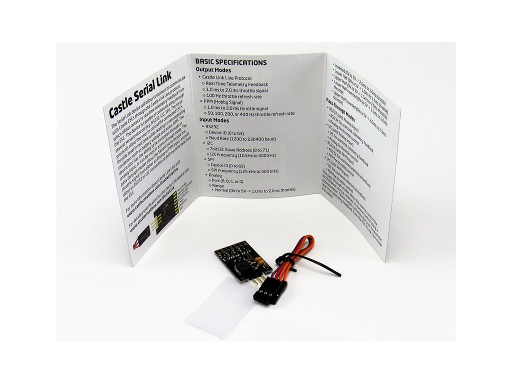 Zařízení Serial Link vám umožní komunikovat s Castle regulátorem prostřednictvím protokolu Castle Link Live. K adaptéru je možno připojit zařízení s protokoly TTL Serial, I2C, SPI. Možnost zapojení: Vstup, Výstup, Průchozí režim. Nastavení přes Castle Link programátor.