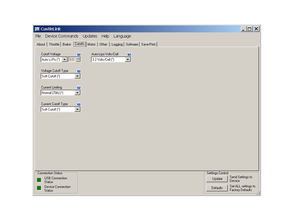 Základní parametry regulátoru lze naprogramovat pomocí plynové páky vysílače nebo programovací kartou. Veškeré parametry regulátoru se pak programují volně dostupnou aplikací Castle Link určené na počítače s operačním systémem Windows. Regulátor se připojuje k počítači přes speciální převodník do USB portu. Pro snazší připojení USB převodníku doporučujeme zakoupit programovací propojku Quick Connect.